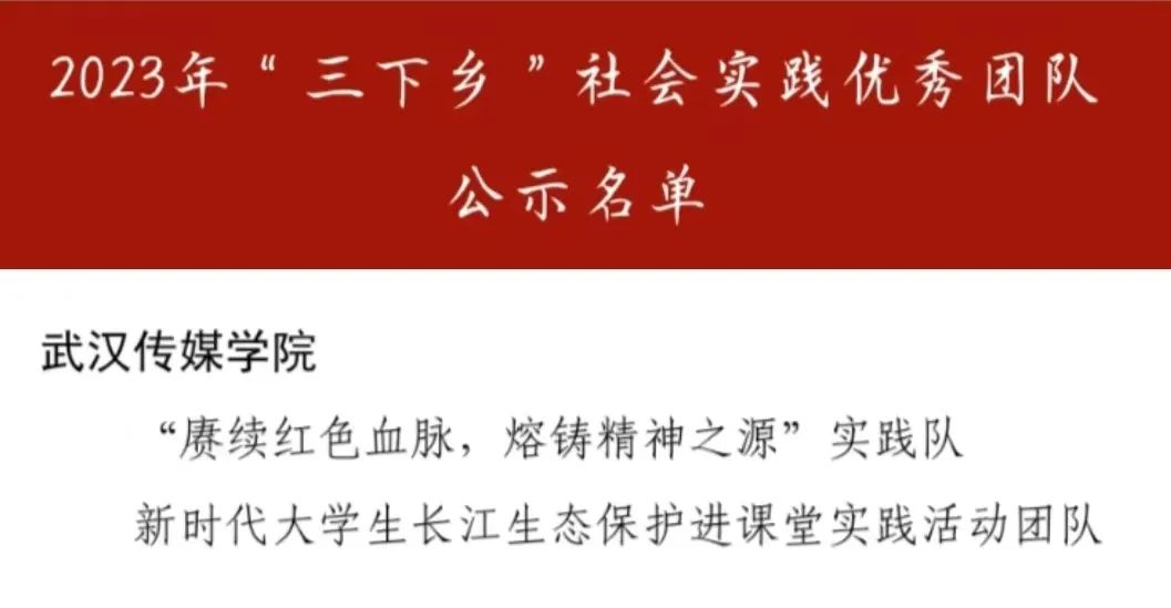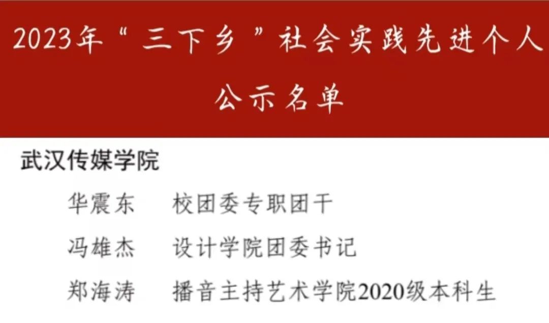 其中我校“赓续红色血脉,熔铸精神之源”实践队、新时代大学生长江生态保护进课堂实践活动团队荣获湖北省2023年“三下乡”社会实践优秀团队。校团委书记华震东老师、设计学院团委书记冯雄杰老师以及播音主持艺术学院2020级本科生郑海涛同学获得湖北省2023年“三下乡”社会实践先进个人。