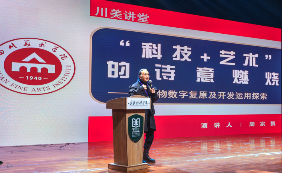 四川美术学院影视动画学院院长,博士生导师,教育部动画、数字媒体专业教学指导委员会委员周宗凯教授则用自己风趣幽默的谈吐吸引了同学们的目光。他从个人经历出发,以《科技+艺术”的诗意燃烧》为核心,提到文创、文旅产业的开发不只有“诗和远方”,还应该有更多元素。艺术工作者们只有用“科技+艺术”的方式将相关发现和研究成果转化为文化资产和产业资源,才能使化石从寂静的埋藏地走向都市、走进产业、走入生活。科技推助艺术发展,艺术让科技更灿烂。
