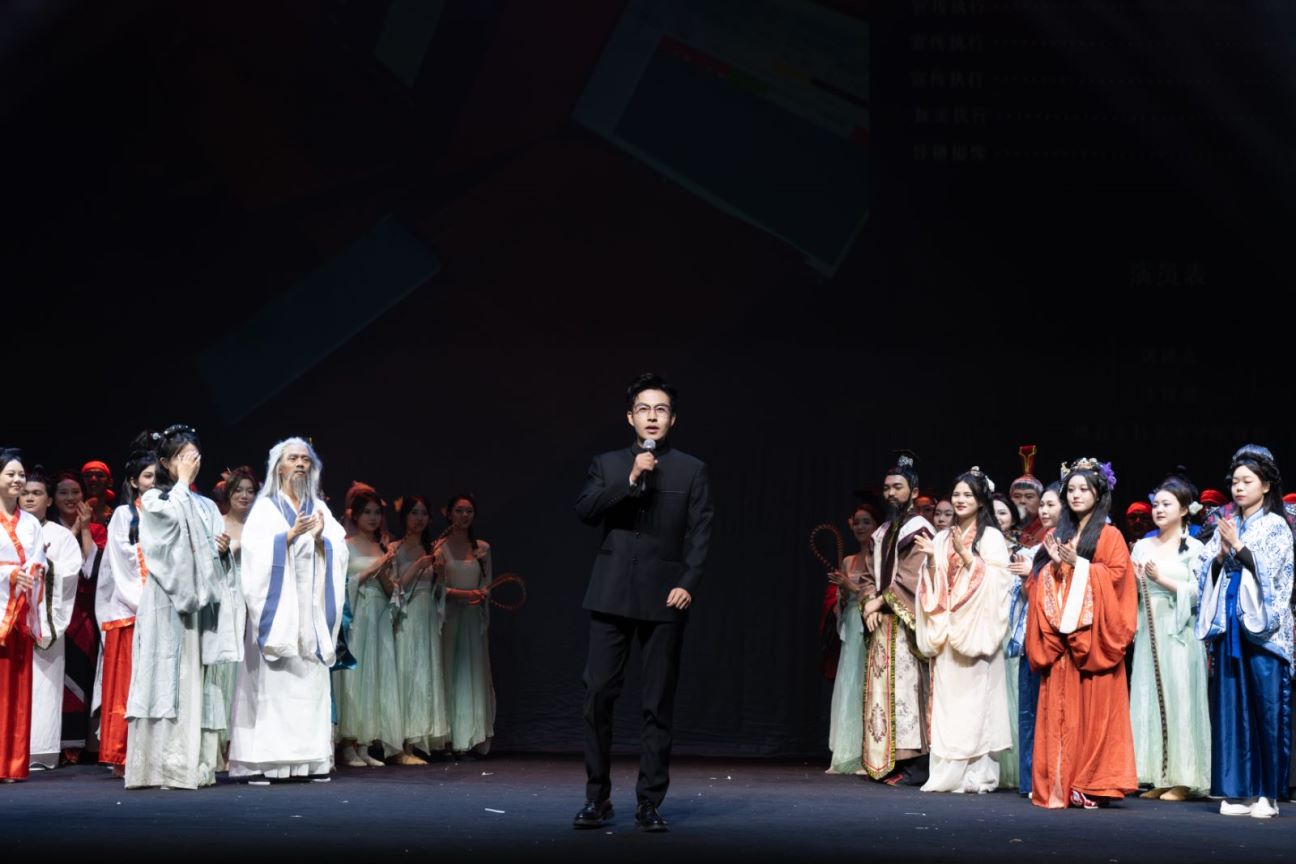 演出谢幕后,作为总导演兼编剧的胡桐老师总结发言。他表示,此次“融道于艺·楚歌”的定稿剧本是今年10月20日完工的,在此之后的选人、排练等一系列工作仅用了一个月的时间,此次作品的成功展演也离不开学校各级领导的大力支持和台前幕后的老师、学生们的辛苦付出。