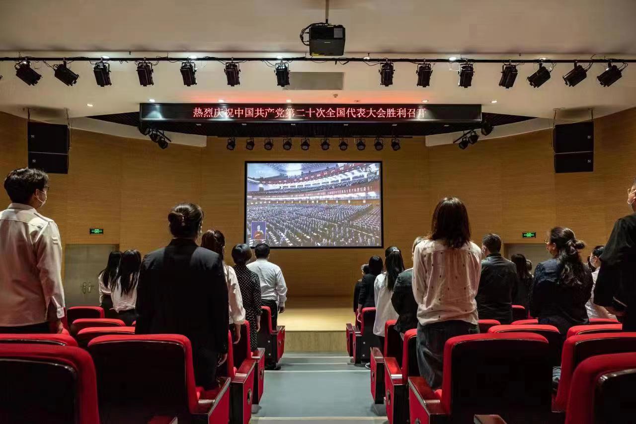 在圆形报告厅,学校各直属支部党员教师一起收看大会直播。