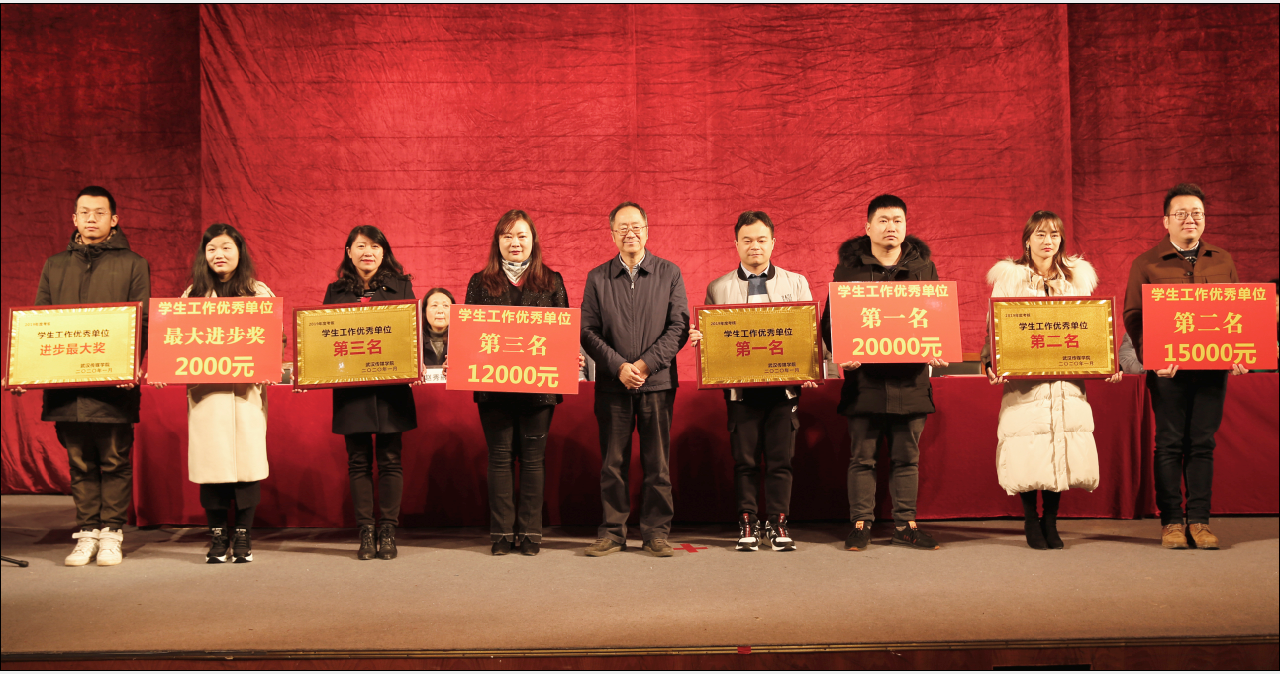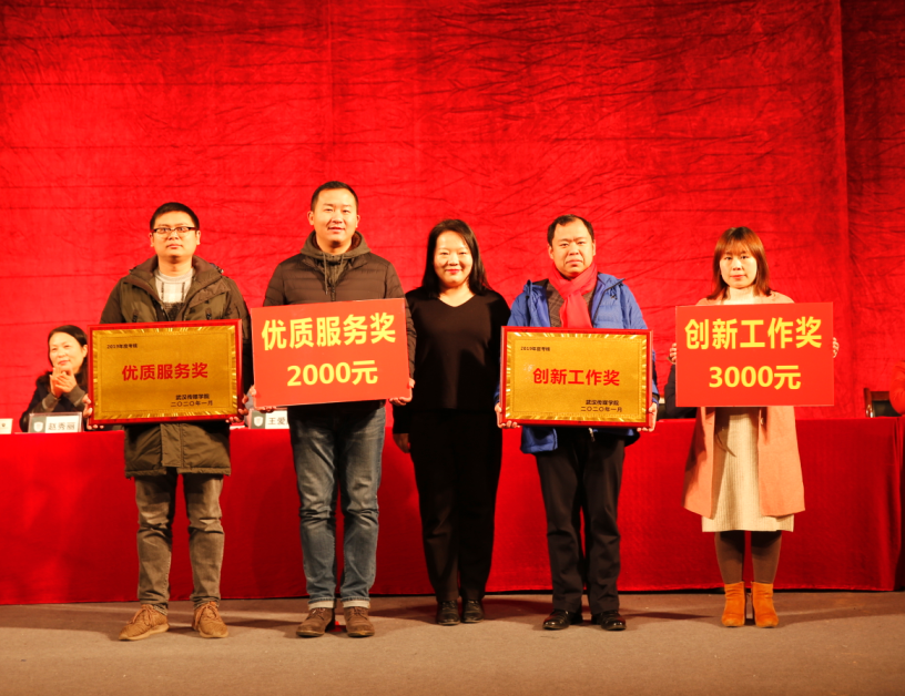为表彰先进、树立典型,学校决定对2019年度教学、学生、就业、科研、党政综合“五项”工作考核优秀及进步 最大的教学单位和行政职能部门综合业绩奖、创新工作奖及优质服务奖单位予以表彰。副校长王爱民宣读《关于发放2019年度学科竞赛指导教师奖励的通知》和《关于表彰2019年度优秀科研成果的决定》。副校长胡学知宣读《关于表彰2019年度考核“优秀”、“良好”教职工的决定》和《关于表彰2019年度教学单位、行政职能部门考核优良及进步单位的决定》。