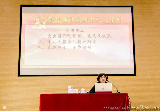 朱巧玲以《不忘初心、牢记使命 高举旗帜 砥砺前行》为题,深入阐述了大会召开的背景、意义及成果,详细从党的十九大的主题、习近平新时代中国特色社会主义思想、过去5年的历史性成就和历史性变革、中国特色社会主义进入新时代、我国社会主要矛盾的变化等方面对党的十九大精神进行了系统全面的解读。