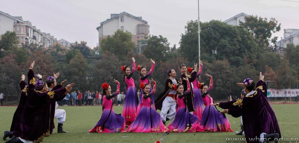 开幕式在2016级表演专业学生带来的维吾尔情景舞蹈《花儿与少年》表演中正式开始。欢快的节奏、充满活力的舞蹈,展现出维吾尔族多姿多彩的独特风情。开幕式表演结束后,仪仗队踏着整齐划一的步伐,护送着国旗庄重地走过主席台。随后,我校各大学院、教职工、裁判员方队依次入场。