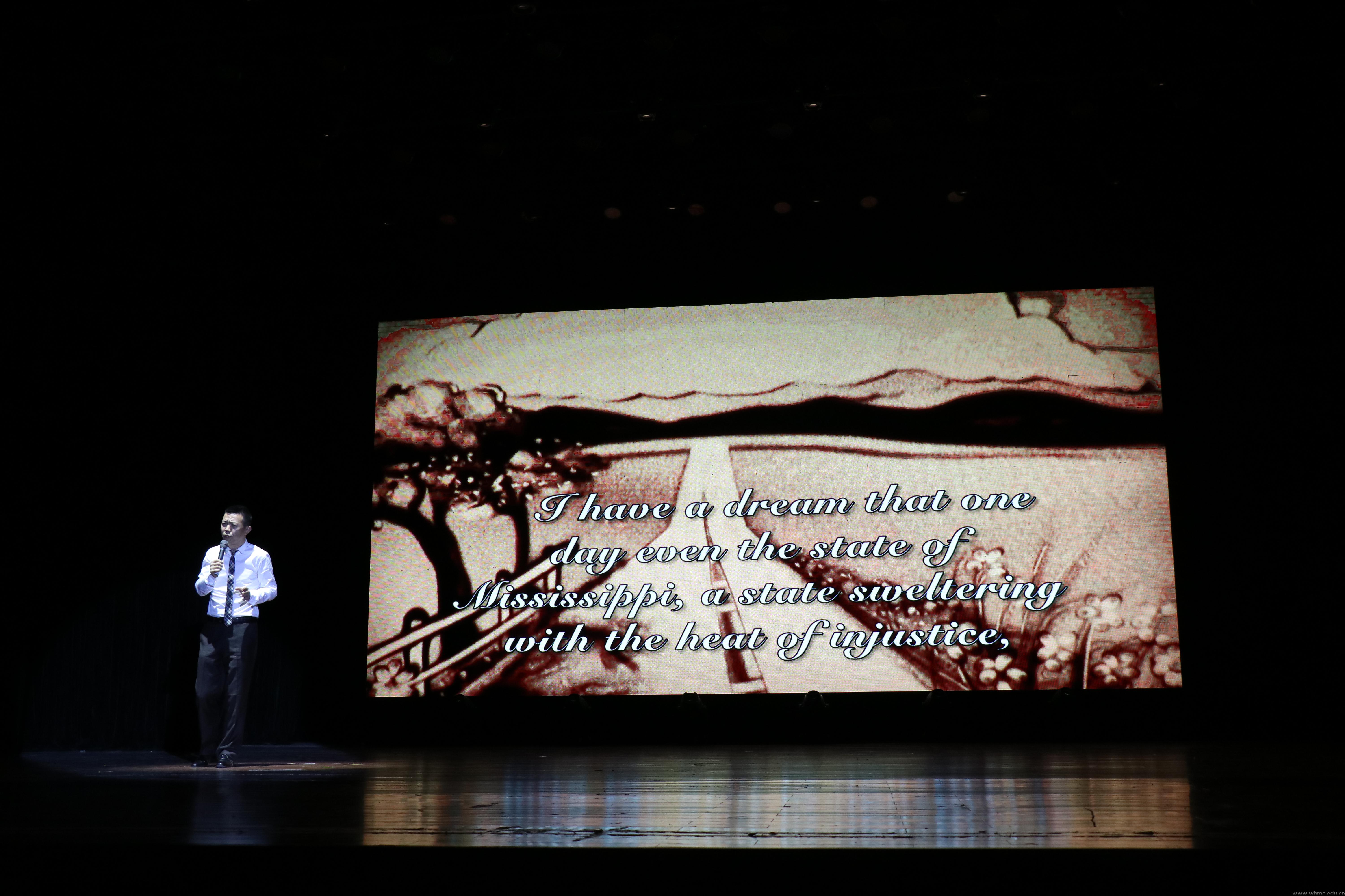 开场舞是设计学院张泽与潘璐老师带来的《夜空中最亮的星》。舞蹈过后,董事长周中斌为大家带来了英文诗《DREAM》朗诵,声情并茂的表演,引得台下掌声一片。周中斌还介绍了自己学习英语的心得,倡导大家努力学习英语,多背诵经典英文文章。