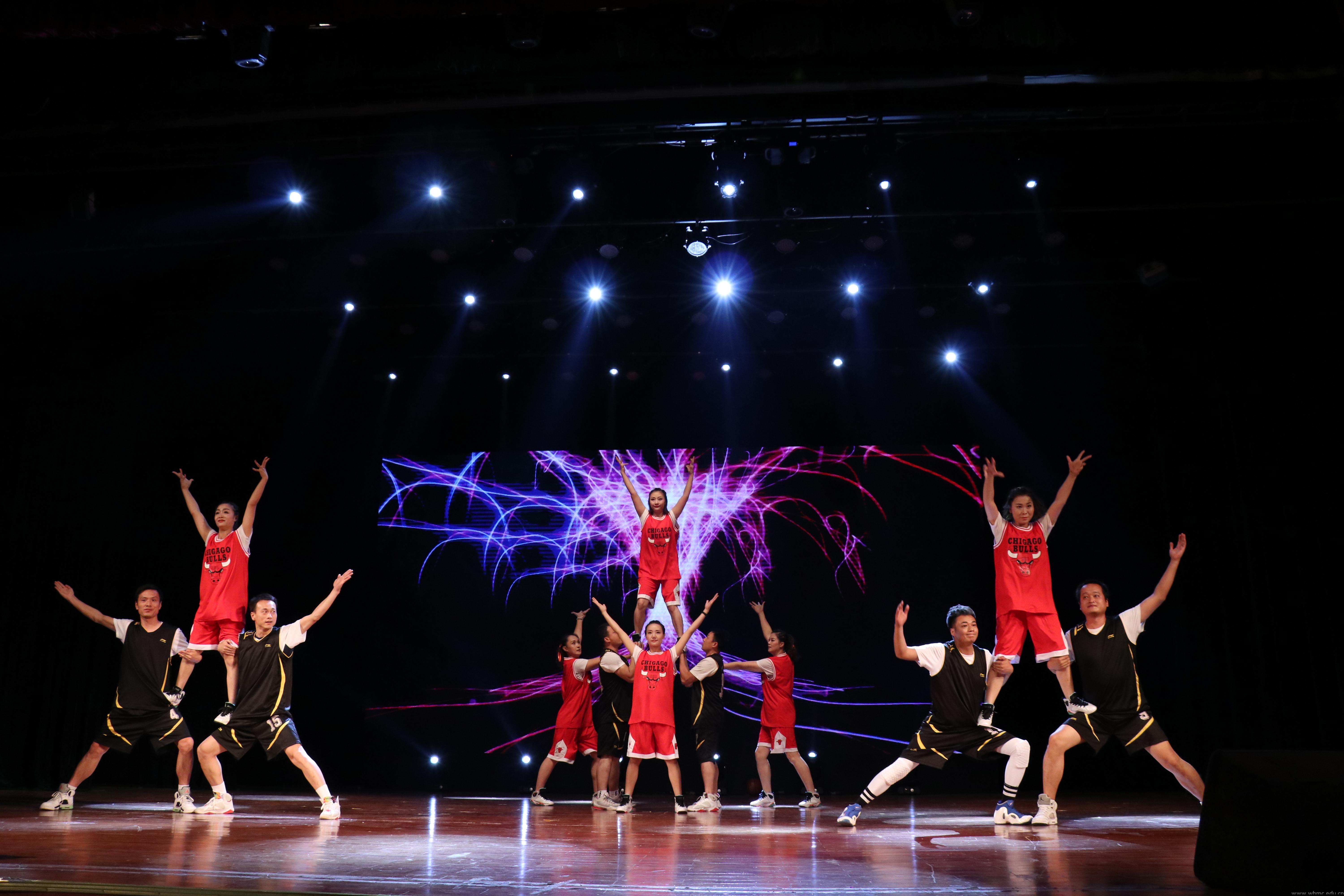 人文与艺术学院老师的表演《体育17行》极具风格特色。篮球老师刘坚展现了他转篮球的绝技,球在指尖不停旋转,从手臂滚动到后背,又从后颈滚动到手上,台下观众直呼“太帅!”。巾帼不让须眉,一身红衣的郝锡娟老师,翻跟斗、劈叉,把剑舞得气势十足。随后,老师们带来的动感十足的体育舞蹈,充满魅力的表演,吸引了观众们的目光。