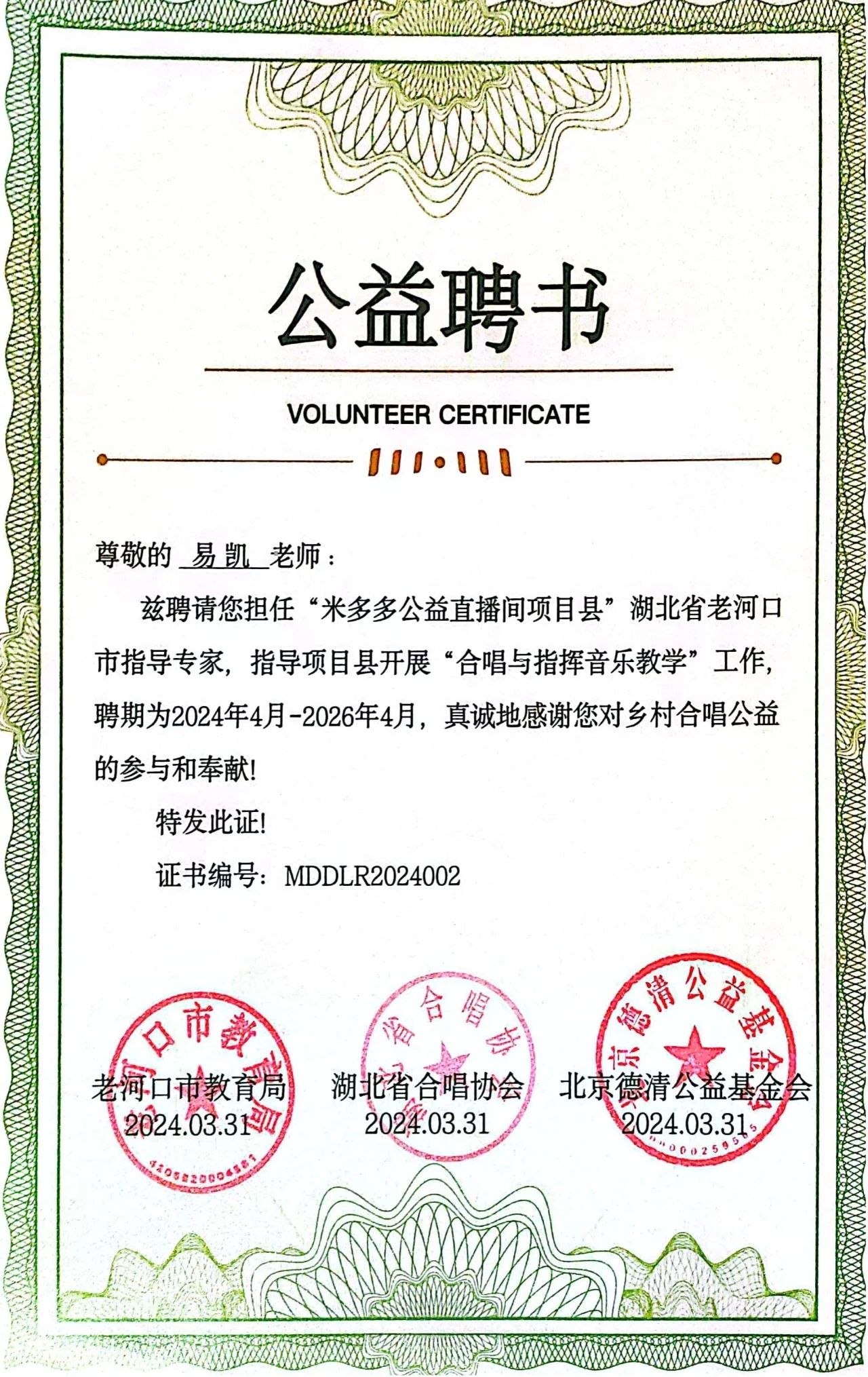 据悉,易凯老师受聘本项目指导专家后,未来将致力于在老河口市推广并实施一系列公益活动,为当地美育建设、校园文化建设贡献力量,让更多的孩子在音乐的海洋中茁壮成长,为乡村中小学的合唱教育与音乐教育注入更多活力与希望。