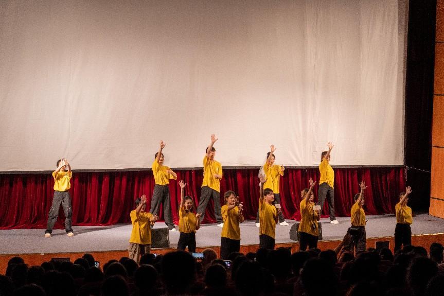 开场前,我校春秋创意工作室的工作人员登台表演了一段婚礼的宣誓仪式,男女主人公相对而立,注视对方,同时伴随着电影主题曲《爱》的倾情演唱及手语舞的表演将观影氛围拉入高潮。