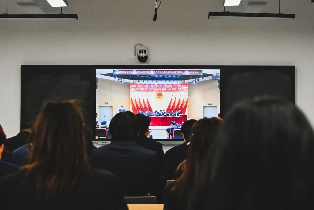 第四代表团代表在大悟校区分会场参会。校团委书记瞿宗巍、电影与电视学院党总支部书记陈磊、校团委副书记张坤、校学生会执行主席方子洁出席此次会议。
