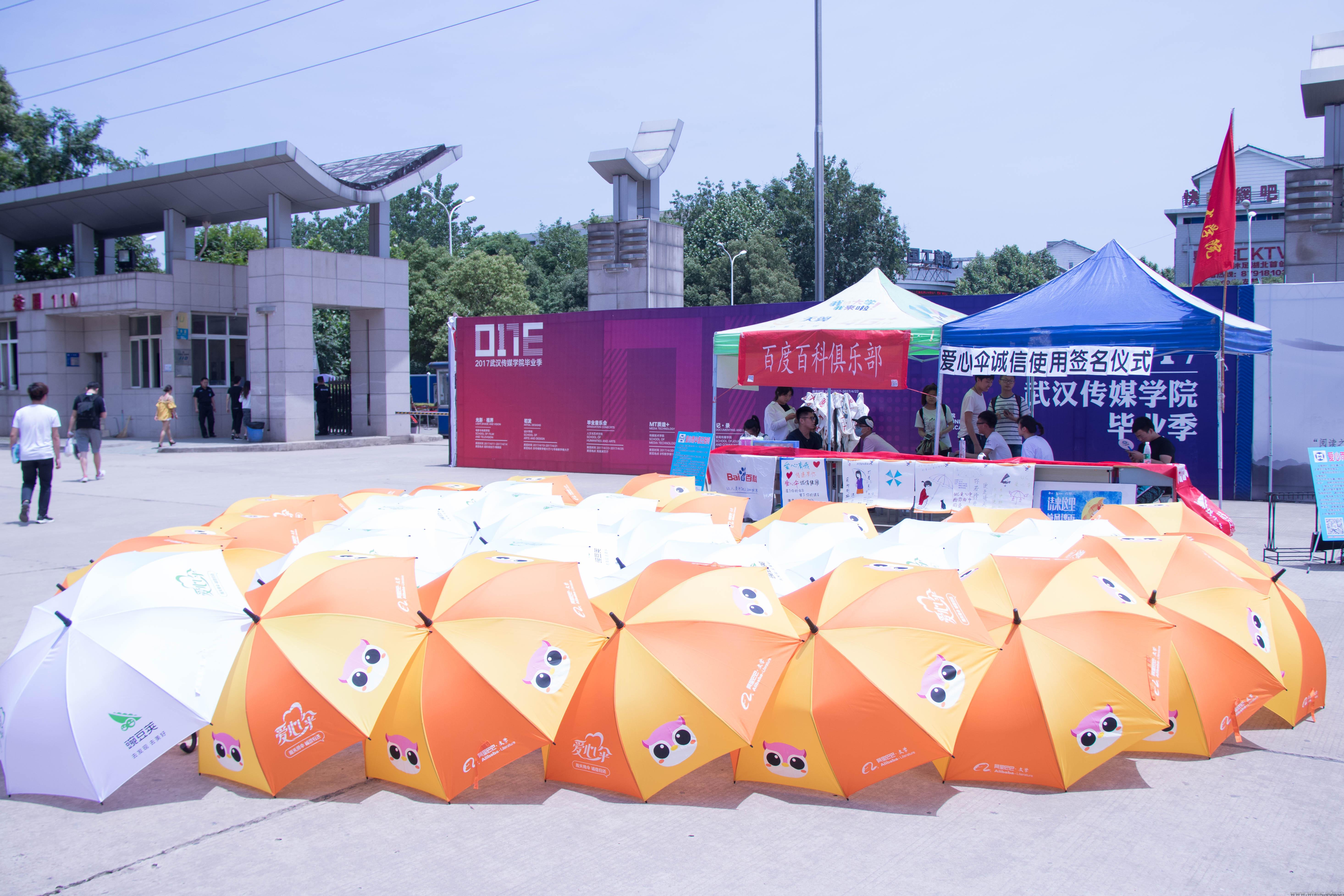 武传新闻网讯(文/见习记者 周学语 图/摄影见习记者 蒋惠敏)5月10日上午11时,我校百度百科俱乐部和传媒技术学院团委学生会、青年志愿者协会共同发起了“雨伞寄深情,爱心永传递”的爱心伞公益活动,并在前广场举行了诚信用伞签名。
