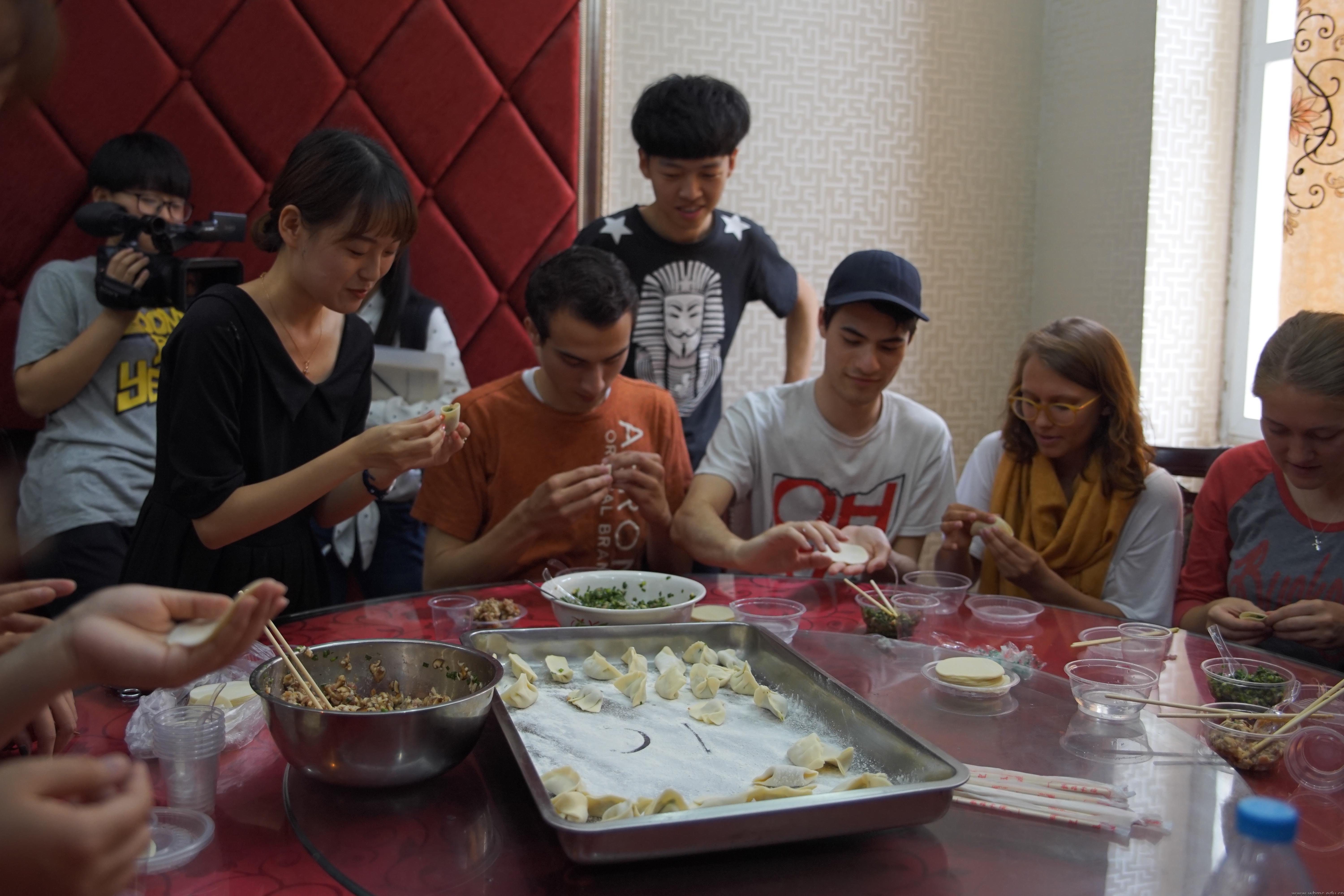 上午10点30分,在学校食堂,我校学子教美国交流生包饺子。 “师傅”杨天骄一点点教“洋学生”们饺子馅的取量,捏褶子的大小和位置,“洋学生”Henry在家里经常做饭,看着“师傅”杨天骄包了两个便学会了,有模有样的饺子让“师傅”们纷纷称赞。而不走寻常路的Jacob没学会,他仿照做汉堡的样子,把饺子馅夹在两片饺子皮中。20分钟后,100多只饺子大功告成,尽管有的饺子被捏成了“包子”“汉堡包”,有的被煮得只剩下一层皮,9人仍为第一次制作的中国美食兴奋不已,将饺子吃的干干净净。在“诗词大赛”节目上,交流生回答了“著名的意大利人马可.波罗是在哪个朝代来的中国?”“中国历史上第一位的女皇帝是?”等问题。
