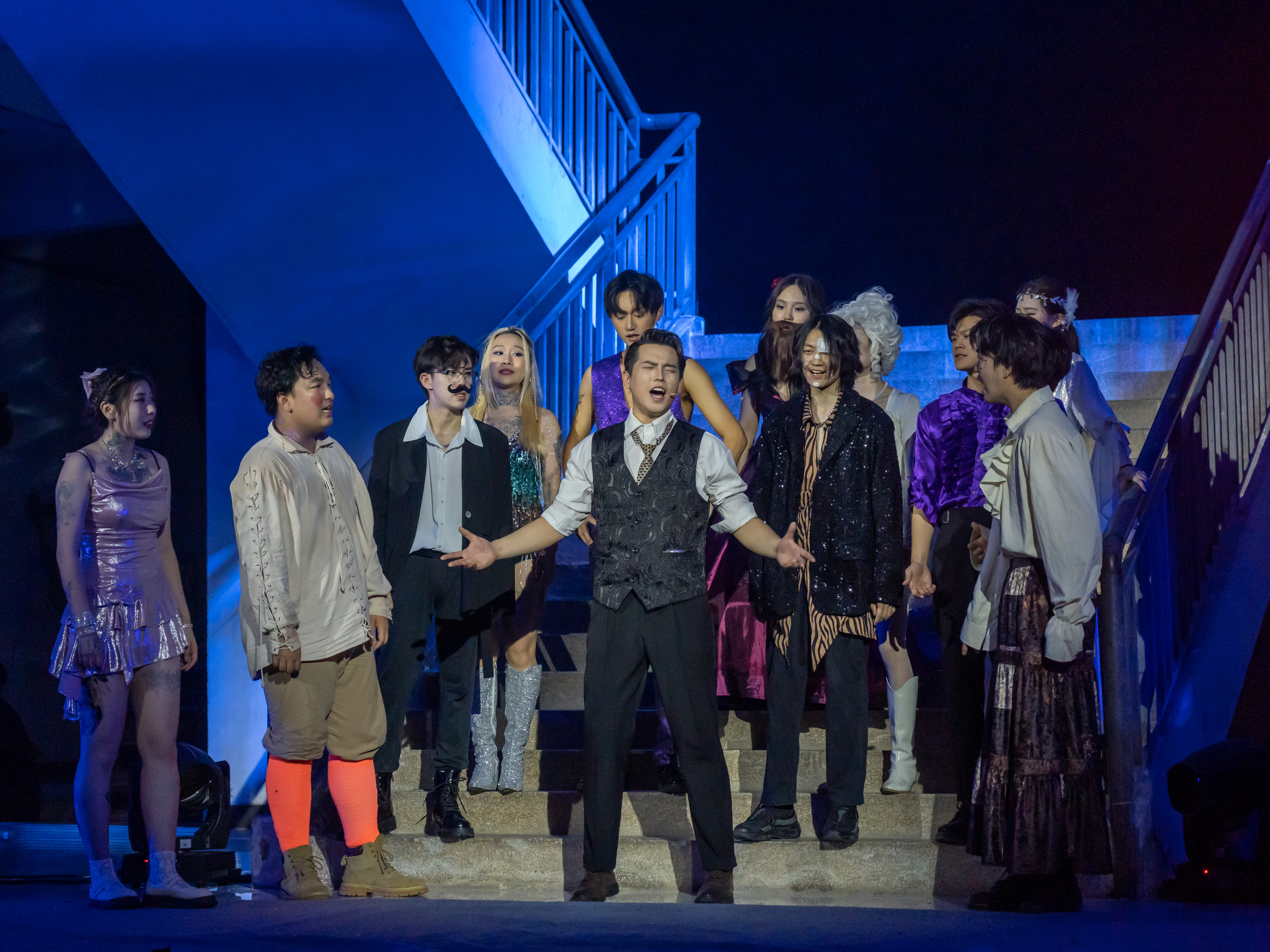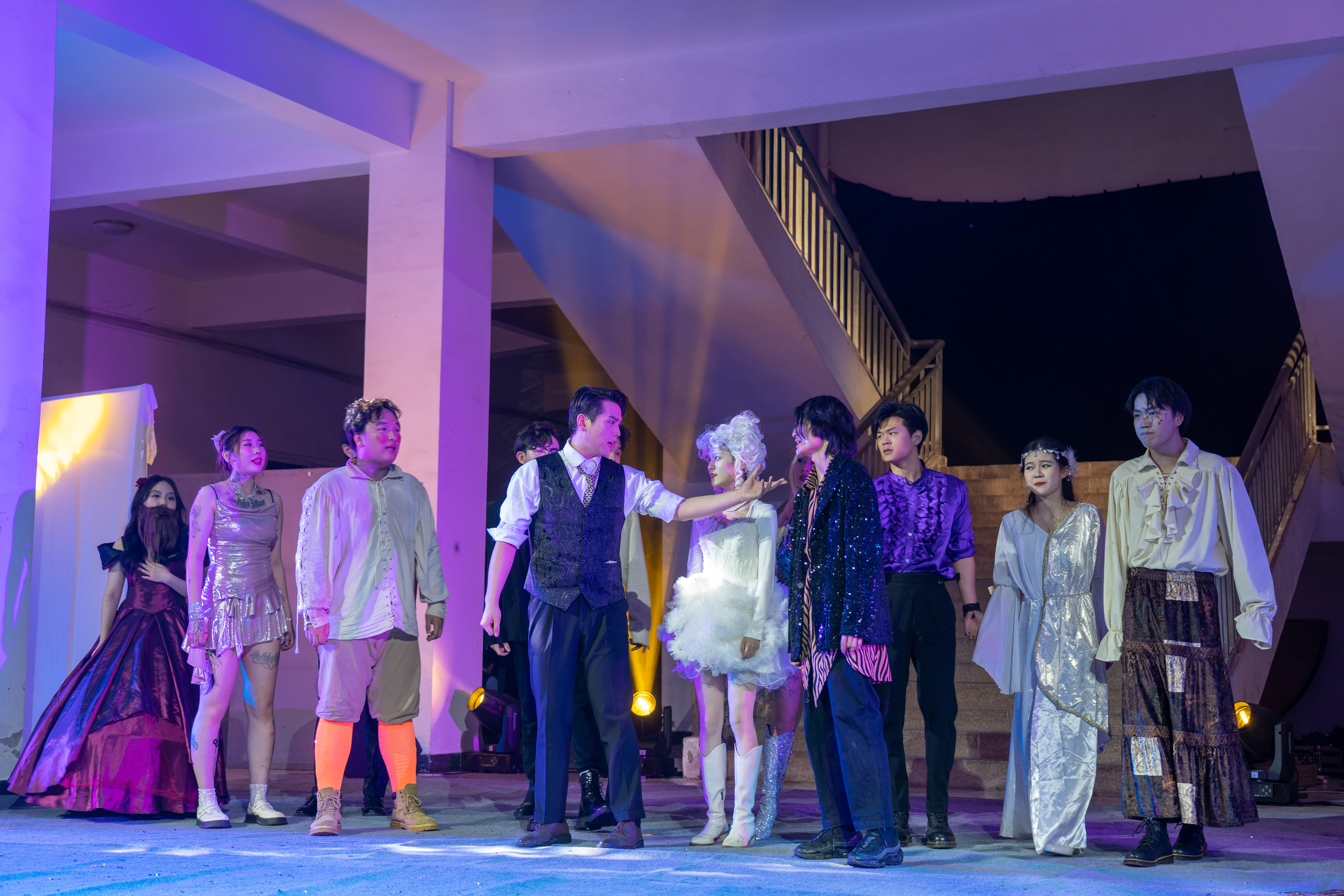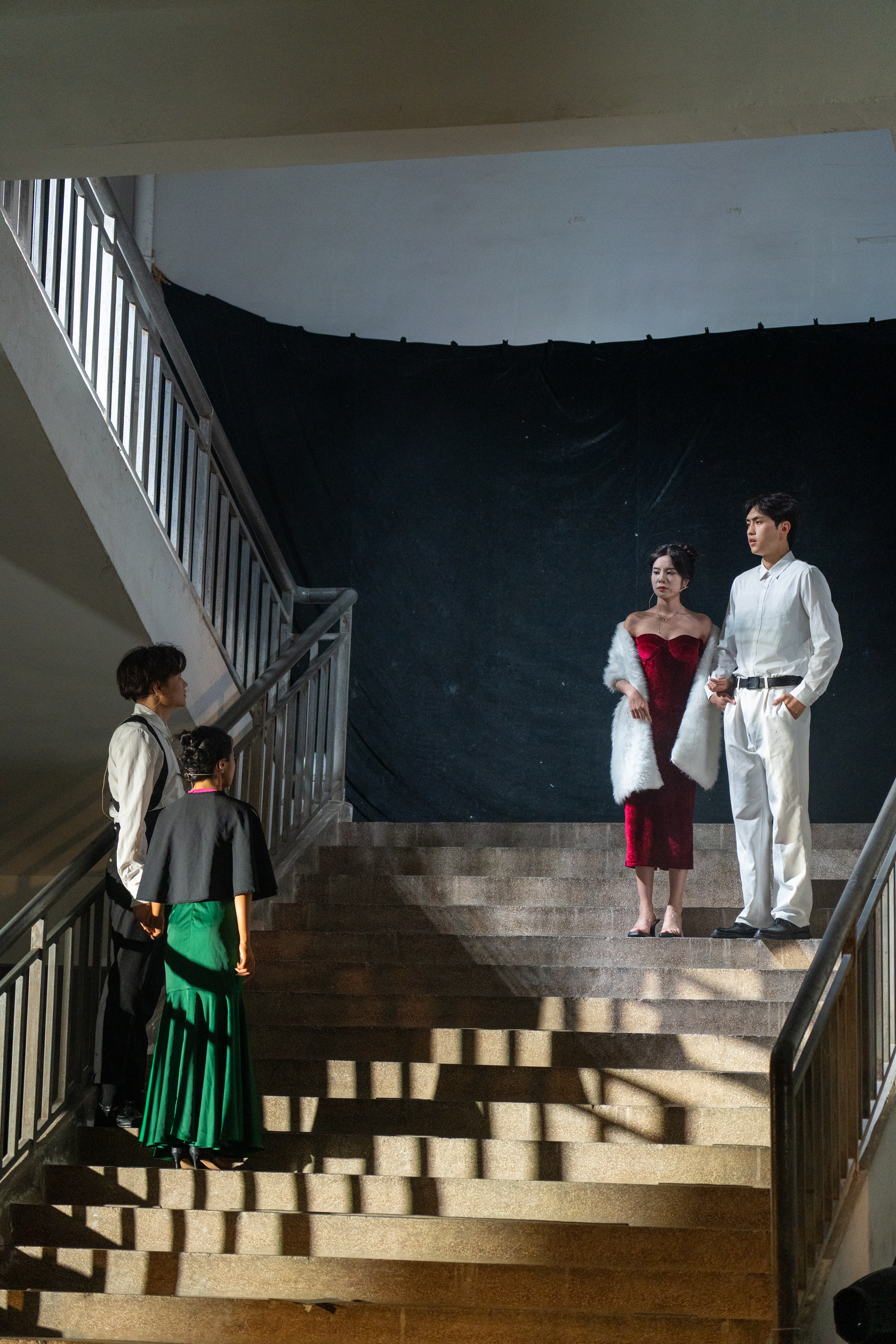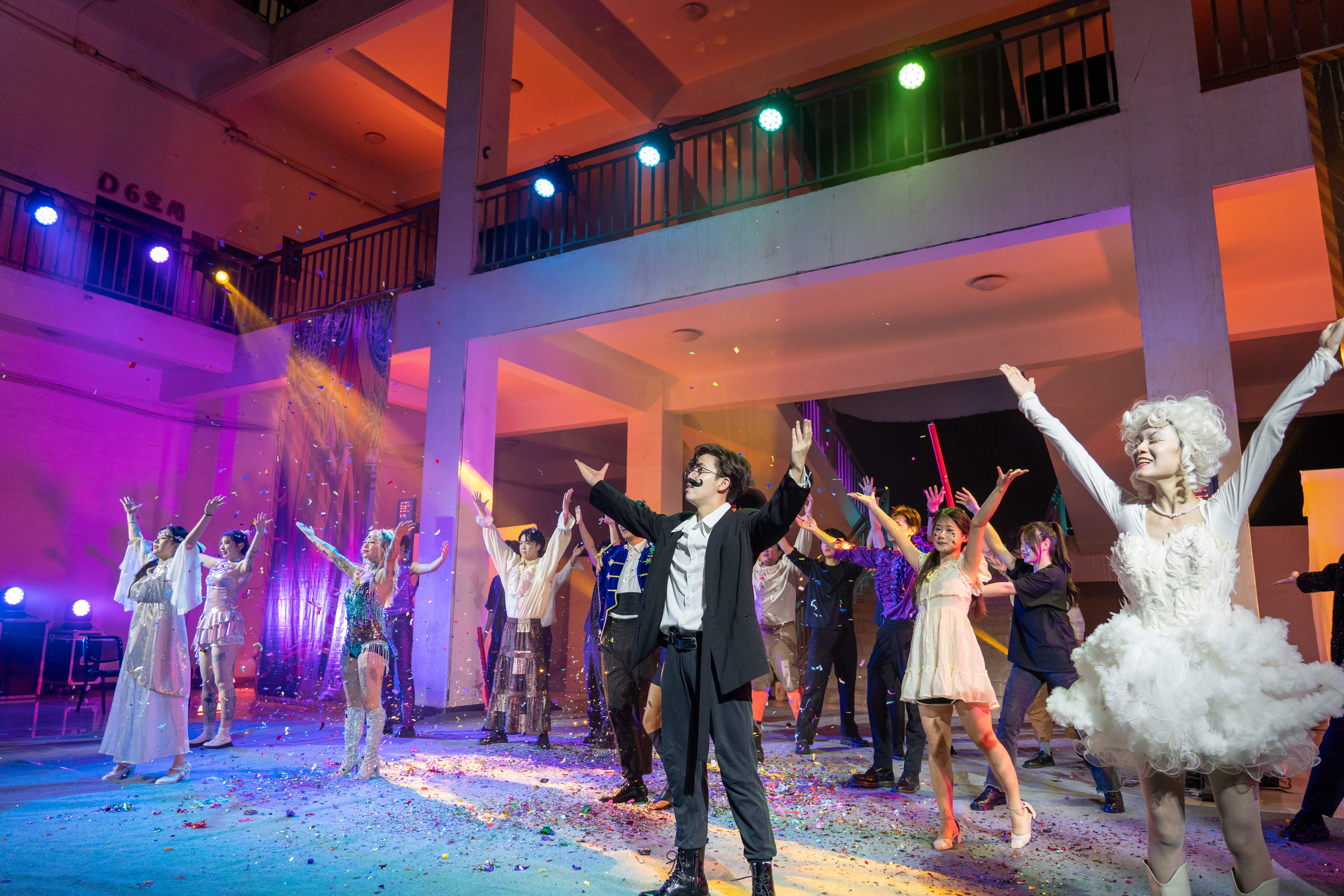 《马戏之王》表演团队巧妙地利用一号教学楼一楼至二楼中梯的建筑特点,将一楼中梯“装饰”成了宴会大厅的阶梯,将回型结构的楼道走廊设定成了大厅二层的看台,再结合现场设置的灯光,原本平平无奇的中梯便被设计成了“豪华宴会厅”的内厅。而围绕中梯前空地摆放的长椅和桌凳自然地成为了这场“特殊”的音乐剧的“第四堵墙”;戏中人奔走戏中,戏外人欣赏戏剧。伴随着现场灯光的转变和演员服饰站位的变化,剧情也随之不断推进。作为音乐剧灵魂的音乐也是演出的一大亮点,主创团队选择中文演唱的方式来进行剧内音乐的演唱,符合中文音乐剧的主题,也带给现场观众新奇的视听体验。