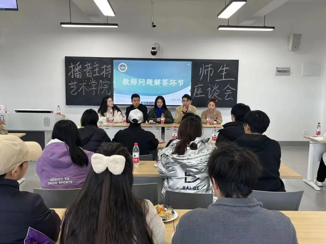 播音主持艺术学院团委书记李思思老师,专业教师白墨、钱婉依、曹泽壮、李一鸣老师,辅导员郑爽、郭子兰老师参与此次座谈会,李思思老师担任主持。