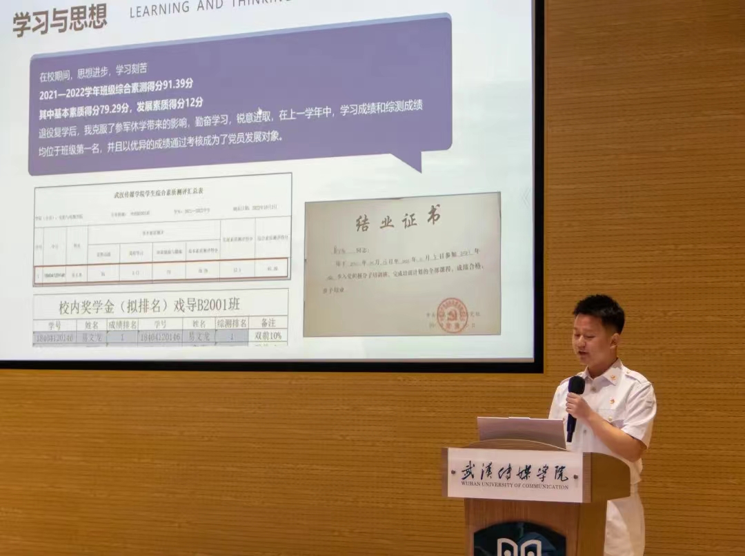 (武传新闻网讯 记者 王艳)10月18日,2021-2022学年国家奖学金竞评大会在圆形报告厅举行,13名学子角逐国奖舞台。经过层层筛选,设计学院陈广生、播音主持艺术学院陈婧怡、电影与电视学院易文龙等8名学子获评2021-2022学年国家奖学金。