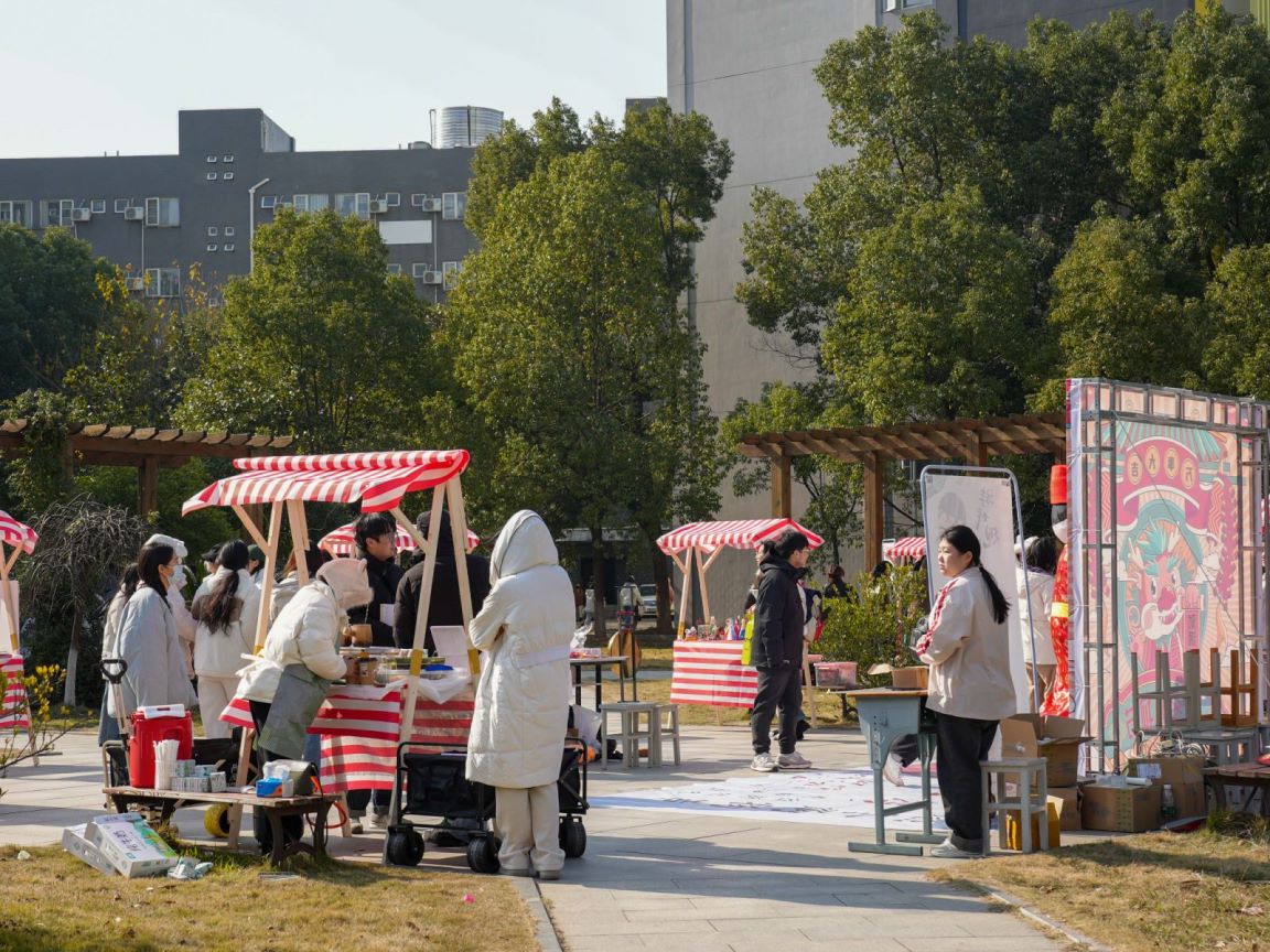 活动现场,还有花艺、文创、游戏等区域,不仅符合当下的时令需要,又满足了大多数的受众需求。在被问及承办单位的准备工作时,活动负责人陈曰表示,除了要准备“燃冬”购物节前期的招商、招展的筹备工作以外,团队成员还要负责平台搭建和展品展销工作,活动现场的所有展示位也都是成员们自行组装的结果。