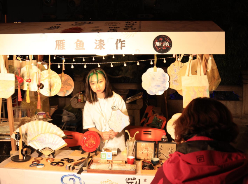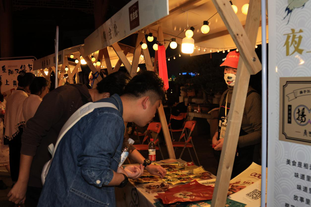 非遗文化市集由会展经济与管理专业毕设团队和文化产业管理专业文创团队联手策划。在皮影戏周边展位上聚集了不少游客,缠花展区向游客展示了绽放在指尖的传统艺术,漆作的展位让游客沉浸式品位漆艺之美,茶艺的桌前游客们感受着茶文化的精髓。扬子江、矮子馅饼、熊金松展位上游客“尝”其味道,品味其文化,感受舌尖上的“非遗美食”。