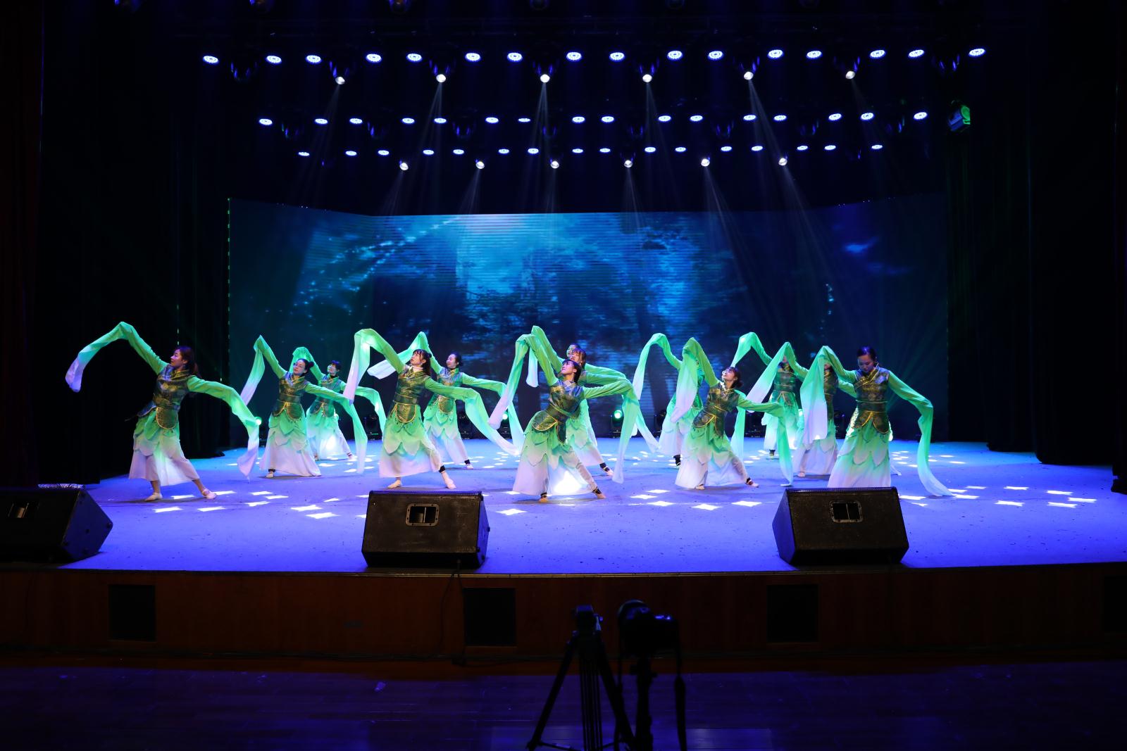 老师们带来舞蹈《踏歌》,身着绿色水袖服在水墨画背景中翩翩起舞,一挥一舞中满是优美洒脱。据了解,这13位舞者是从各学院及行政部门选拔出来的女老师,她们每天中午12点准时在1305教室排练,已经排练了近20天时间。