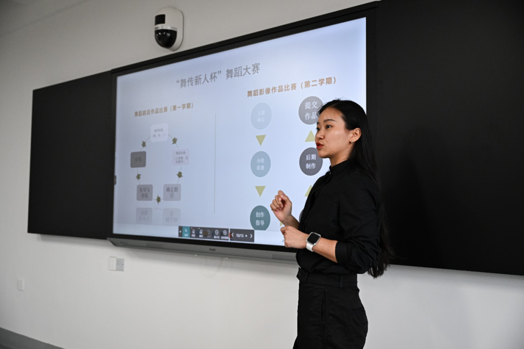 同时,为营造良好的学习氛围,丰富新生们的大学生活,促进良好学风,我校舞蹈学专业教研室还将举办首届“舞传新人杯”舞蹈大赛。现场由教师夏可馨、李翠颖分别介绍了舞蹈剧目作品比赛、舞蹈影像作品比赛两大板块的赛事安排及要求,鼓励同学们发挥自己的热情与创造力,积极参与本次比赛。