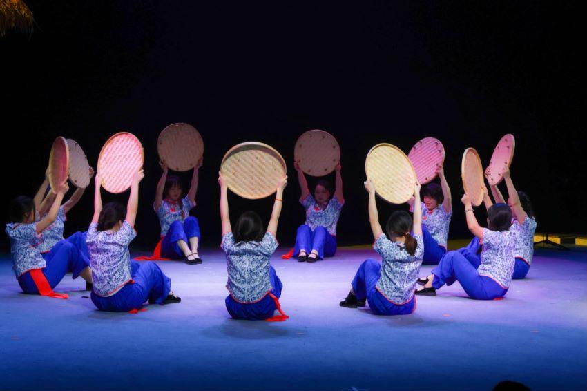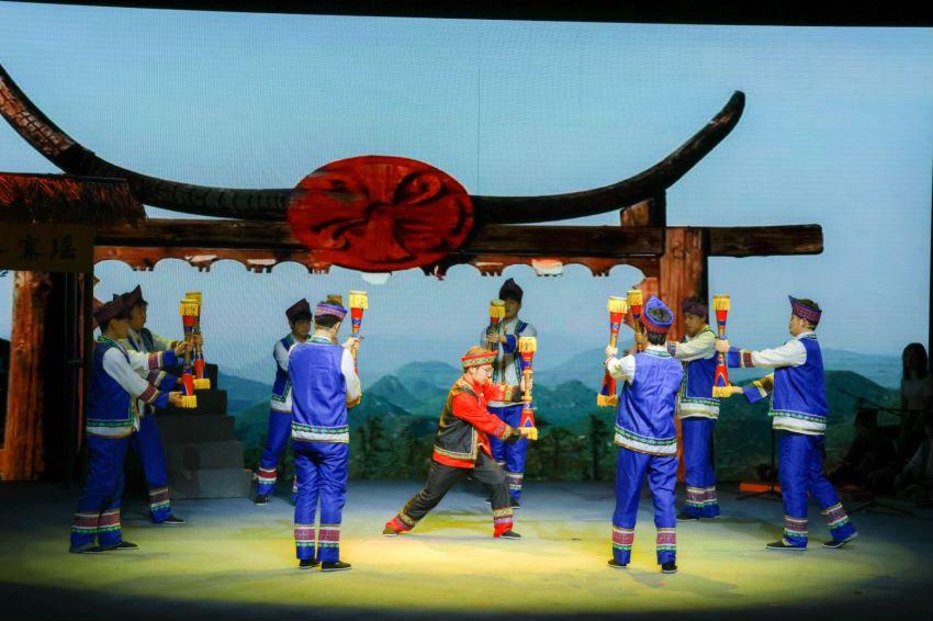 随着激昂的配乐,作为民俗文化特色之一的竹竿舞在有节奏、有规律的碰击声中踏歌而来,展现着瑶寨人民面对丰收时的喜悦。形象的人物塑造、富有张力的表演配合饱含情感的音乐令全场沸腾,现场观众报以热烈的掌声与持续不断的喝彩声。