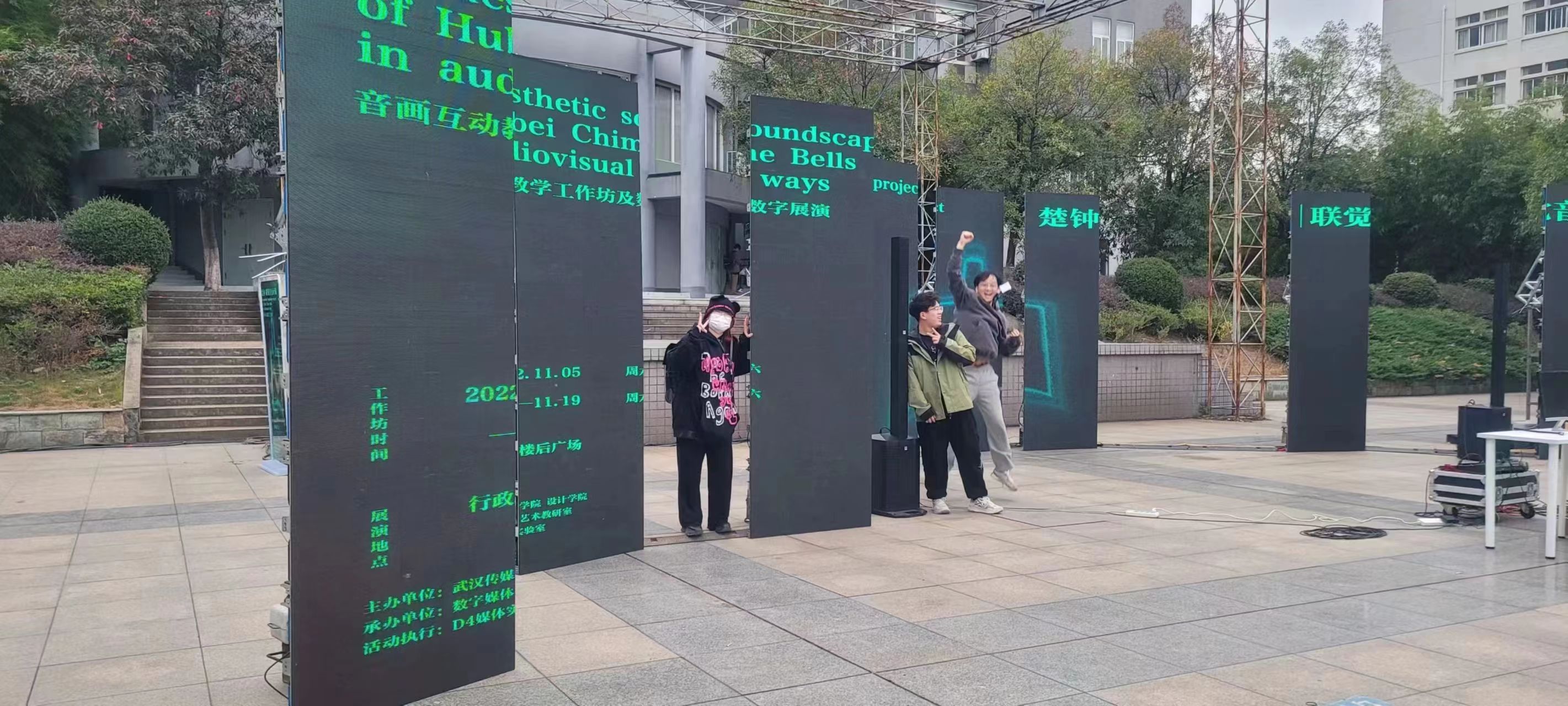11月19日下午,《楚钟:联觉音景计划》音画互动营展演活动于行政楼后广场正式开展。同学们将15天内的所学所得以学生作品展示的形式进行集中展演,最终将由各位导师进行互动营大奖评选。