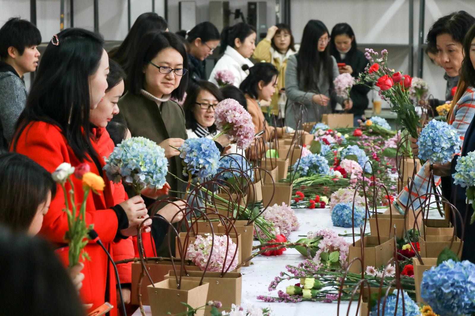 “色系不能超过三种,花朵的摆放应该错落有致,大花篮应该可以放一个绣球。”活动伊始,花艺老师对选取花材、色系以及花朵摆放进行讲解指导。人文与艺术学院胡涛涛老师手举花篮,请教花艺老师自己的花篮花束搭配蓝色还是浅红色更为好看。“用教室准备的鲜花学习插花,心情也放松了。”胡老师表示,她将把亲手制做的花蓝送给母亲。