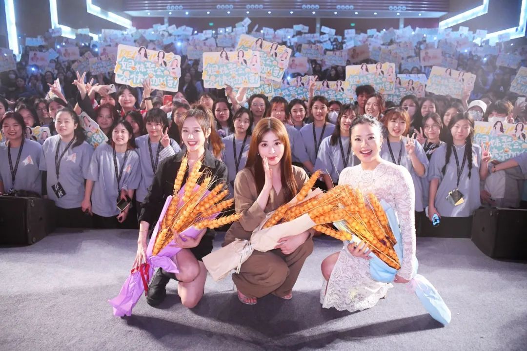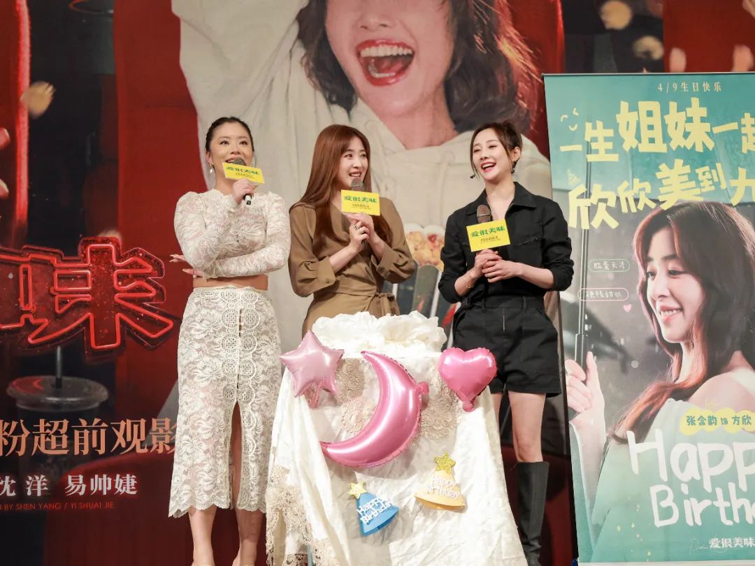 值得一提的是,活动当天恰逢主创人员之一张含韵的生日,在电影点映完成后,三位主创人员来到现场,演员李纯、王菊为好姐妹张含韵送上生日惊喜,并与现场近千位观影学子同唱生日歌,一道为张含韵送上暖心的生日祝福,暖心又有爱,也呼应了“姐妹聚会,快乐加倍!”这一电影主题。