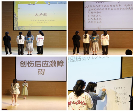 本次决赛共分为“心理选择题”、“心理名词解释题”、“心理填空题”三个环节。首先进行的是“心理选择题”和“心理名词解释题”,这两个环节由浅及深多个层次考验了大学生心理健康的素养,从而逐出各个队伍的积分排名,再通过“心理填空题”选择绑定的队伍来提升队伍积分或者降低对手的积分排名。每支队伍都激情满满,拼尽全力去获得积分,赢得了场下的观众和评委阵阵掌声。