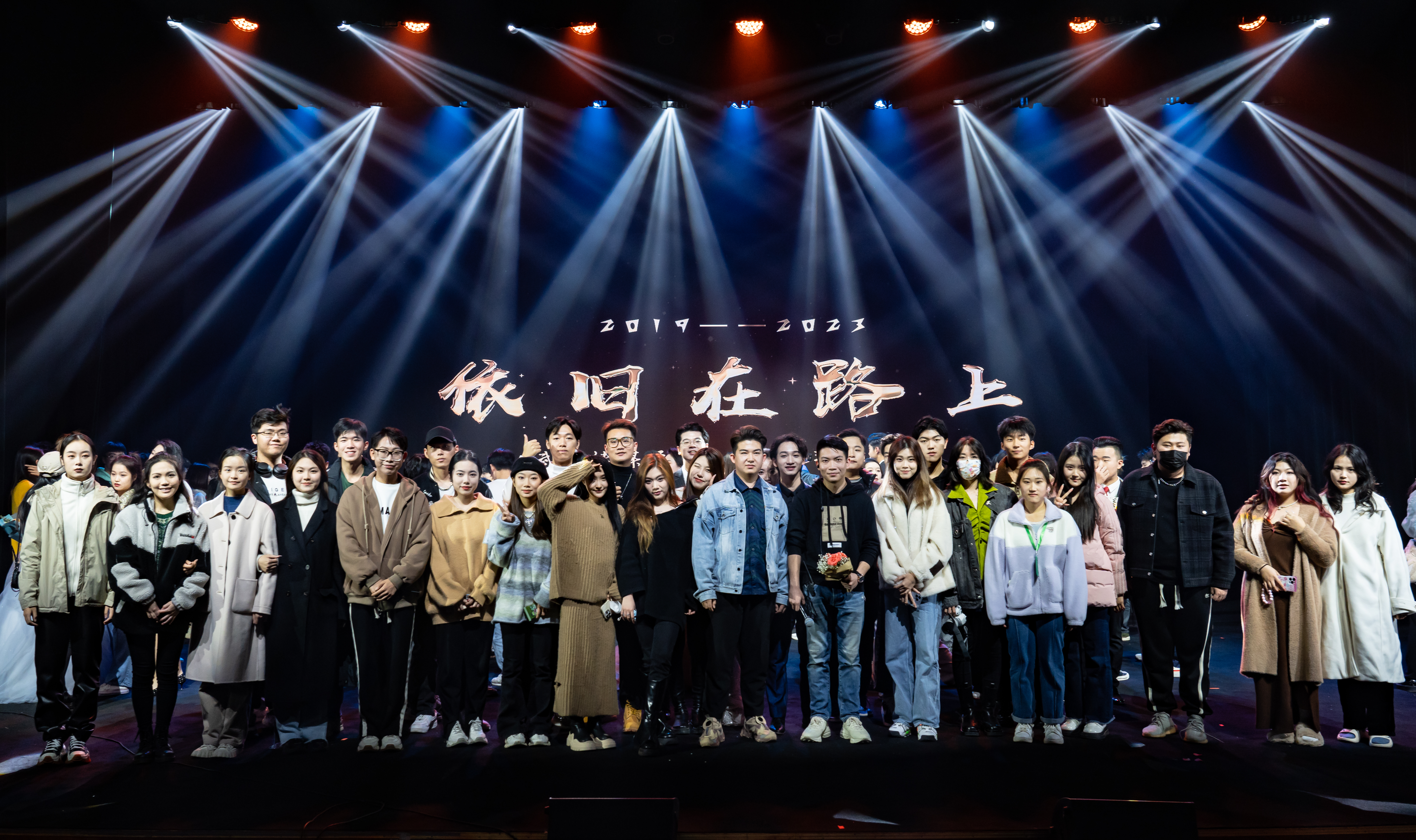 晚会最后,担任本次毕业晚会导演同时也是播音主持艺术学院教师的胡桐与19级毕业生共同登台。胡桐代表晚会导演组与19级毕业生代表们互赠鲜花,以作别礼。最后,在场全体领导、老师和19级毕业生上台合影留念,本次播音主持艺术学院2019级《依旧在路上》毕业晚会圆满谢幕。
