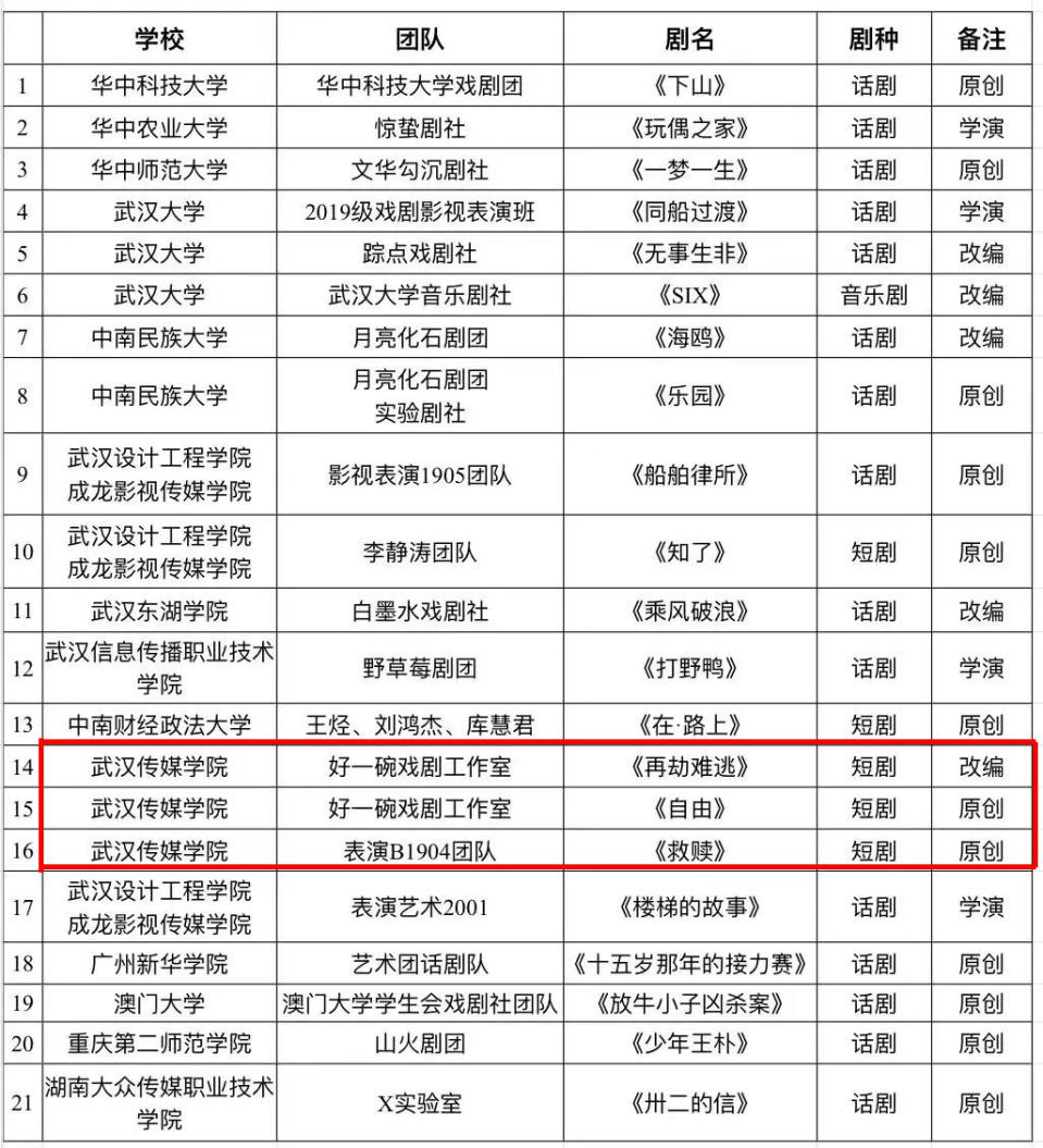 (武传新闻网讯 记者 卢诗源)2022年4月20日,武汉市文联公布第八届武汉大学生戏剧节入围展演剧目。由我校电影与电视学院师生自主改编短剧《在劫难逃》,原创短剧《自由》《救赎》进入决赛阶段的展演。