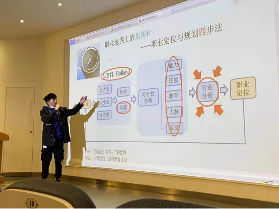 接下来,设计学院王源老师分享了《应届生的生涯规划》方面的内容,针对毕业生的求职问题并结合自身经历进行了有关生涯规划的指导,分析了毕业生该如何去选择未来从事的职业或岗位。王源老师在讲座过程中亲切耐心、循循善诱,就毕业生们所关心的“简历一片空白怎么办”“遭遇学历歧视怎么办”等问题给出了具体的指导和建议。