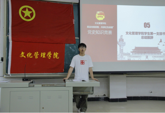 在活动的最后,文化管理学院学生第一支部书记汪丰毅做总结讲话。他讲到,本次比赛集知识性、趣味性、互动性于一体,题目主要涵盖中国共产党百年奋斗历程、党的理论创新成果及习近平新时代中国特色社会主义思想等内容。本次党史知识竞赛活动是我院开展庆祝建党100周年系列活动之一,旨在带领全体师生回顾党的百年光辉历程。作为新时代的青年大学生,希望大家能在本次党史竞赛活动中认真学习党史,重温党的历史,牢记初心使命,坚定理想信念。