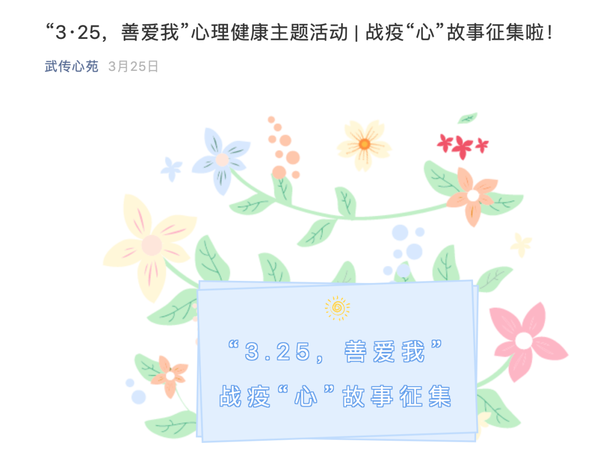 2020年3月25日-4月15日,米兰体育网页版登录大学生心理健康教育中心开展“3·25,善爱我”心理健康主题活动——战疫“心”故事征集。本次活动旨在倡导大学生善待自我,关爱自我,怀着一份温暖,包容欣赏和接纳自己,传播抗疫期间的心理正能量。