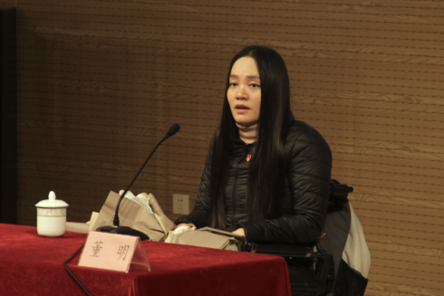 董明以自己身处残疾的不幸为例,告诉学生要“不忘初心”。“虽然我残疾了,可我还是非常渴望爱和幸福,但爱和幸福不是等待别人给予,而是将爱传递,在爱别人的过程中,我也得到了最幸福的人生。”此外董明说到“不忘初心”的意义,她认为大家第一次满怀善良、纯粹、天真地面对这个世界,可能会被他人有意无意地伤害,当第一次被他人伤害,第二次,第三次,甚至第100次,依然能够选择善良就是“不忘初心”。