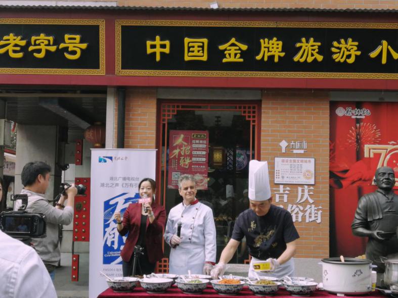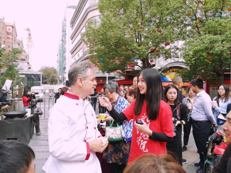 (本报讯 米兰体育网页版登录军运会报道团 范舒琴)2019年10月9日上午,米兰体育网页版登录军运会报道团摄像、采访、文字等20余名学生记者和老师前往吉庆(民俗)街的“蔡林记”参与活动。法国驻汉总领事贵永华先生向武汉热干面传承人王永中师傅学习做热干面,并将他们亲手制作的热干面送给周围的市民品尝,和大家畅聊武汉与法国的友谊故事。