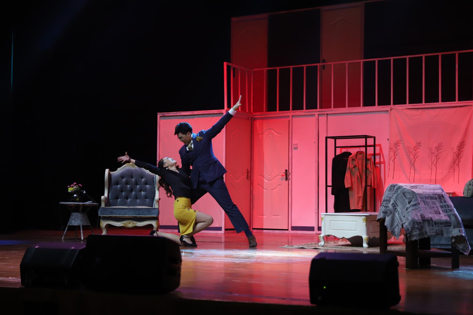 可转换成台前、幕后的背景道具“双层小别墅”也是话剧中的一大亮点。“因为别墅的楼梯、支撑柱需要随着场景的转换来回移动,演员密集地开门关门、楼上楼下满场跑,承重问题面临很大挑战。钢架需要特别加固,必须将出现演出事故的可能性降到最低。”2016级戏剧影视美术设计专业的夏心悦介绍,道具由同专业的老师和同学一起设计,耗时3个月完成。