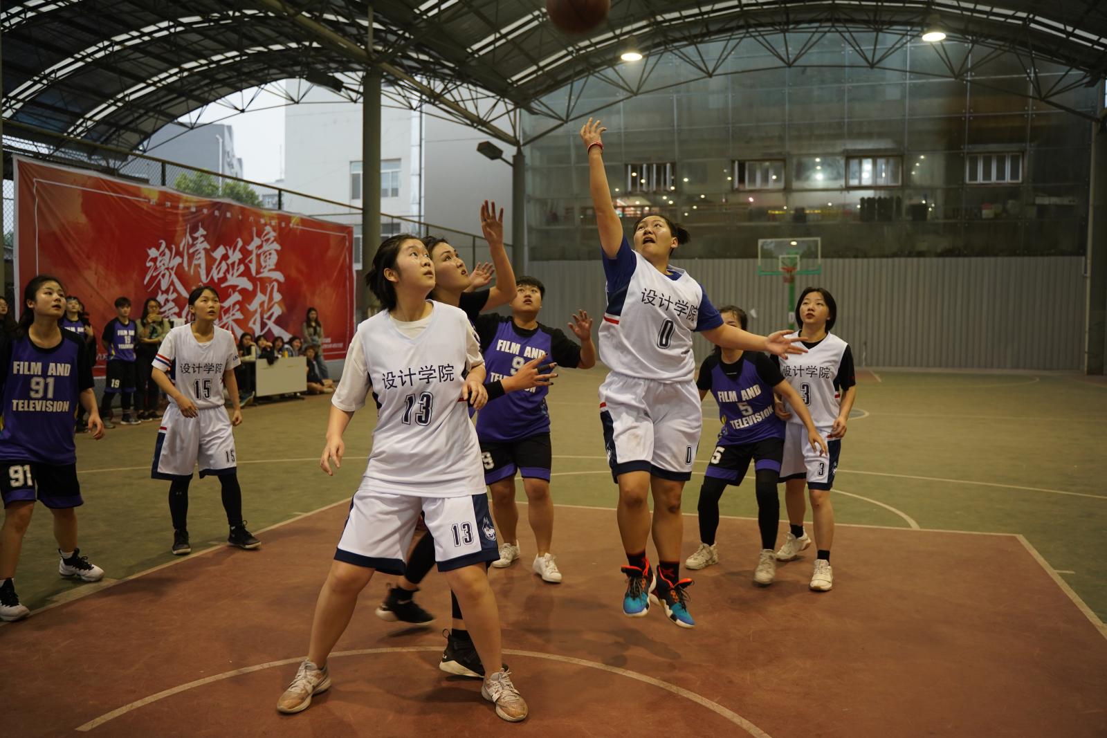 女篮的比赛也同样激烈,设计学院与电影电视学院的进攻和防守都十分严谨,第三节之前双方比分都呈胶着状态。在0号球员曾茜紫的带领下,设计学院夺球快攻,远程三分命中。电影与电视学院91号球员田晶晶不甘落后防守反攻,设计学院曾茜紫快速带球过人内线投篮命中。在她的带领下,设计学院以8分之差夺得女子组冠军。