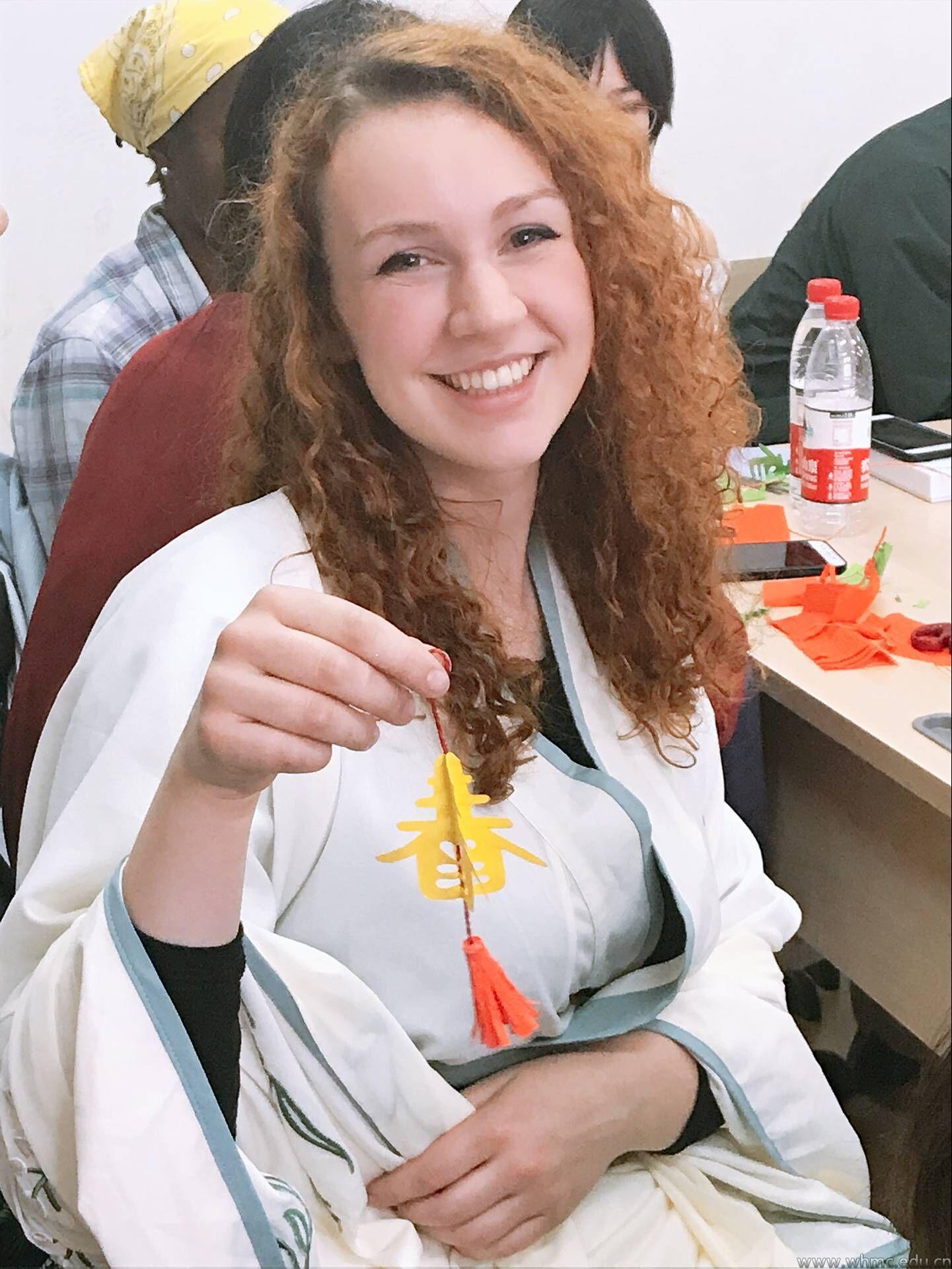 “将一张正方形纸对角折叠,再对折一次,找出中心点后展开,恢复到三角形状态。”9名交流生还体验了中国剪纸,“师傅”教授制作“春”字窗花。看到自己成功剪出了剪纸,交流生们都乐得合不拢嘴,纷纷向朋友展示自己的手工作品。剪纸过程中,几位交流生又对中国汉服产生了浓厚兴趣。身为男生的施胜甫也禁不住汉服的诱惑,决定亲自穿上它“零距离”感受中华文化。施胜甫穿上汉服后,其他几位交流生也“争先恐后”地试穿汉服留影纪念。