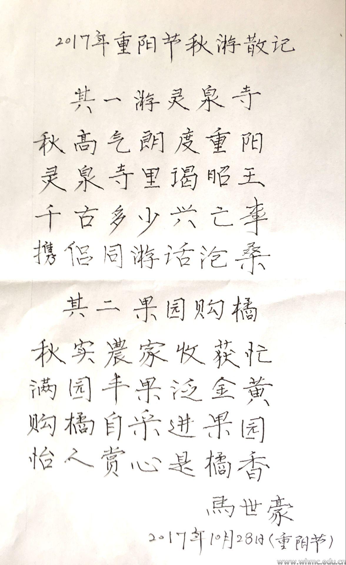 游园结束后,老教师们纷纷表示,这次游园之旅行程丰富,又具文化底蕴,更是一次清肺之旅。开心之余,教学督导与评估中心教学督导马世豪教授赋诗两首。