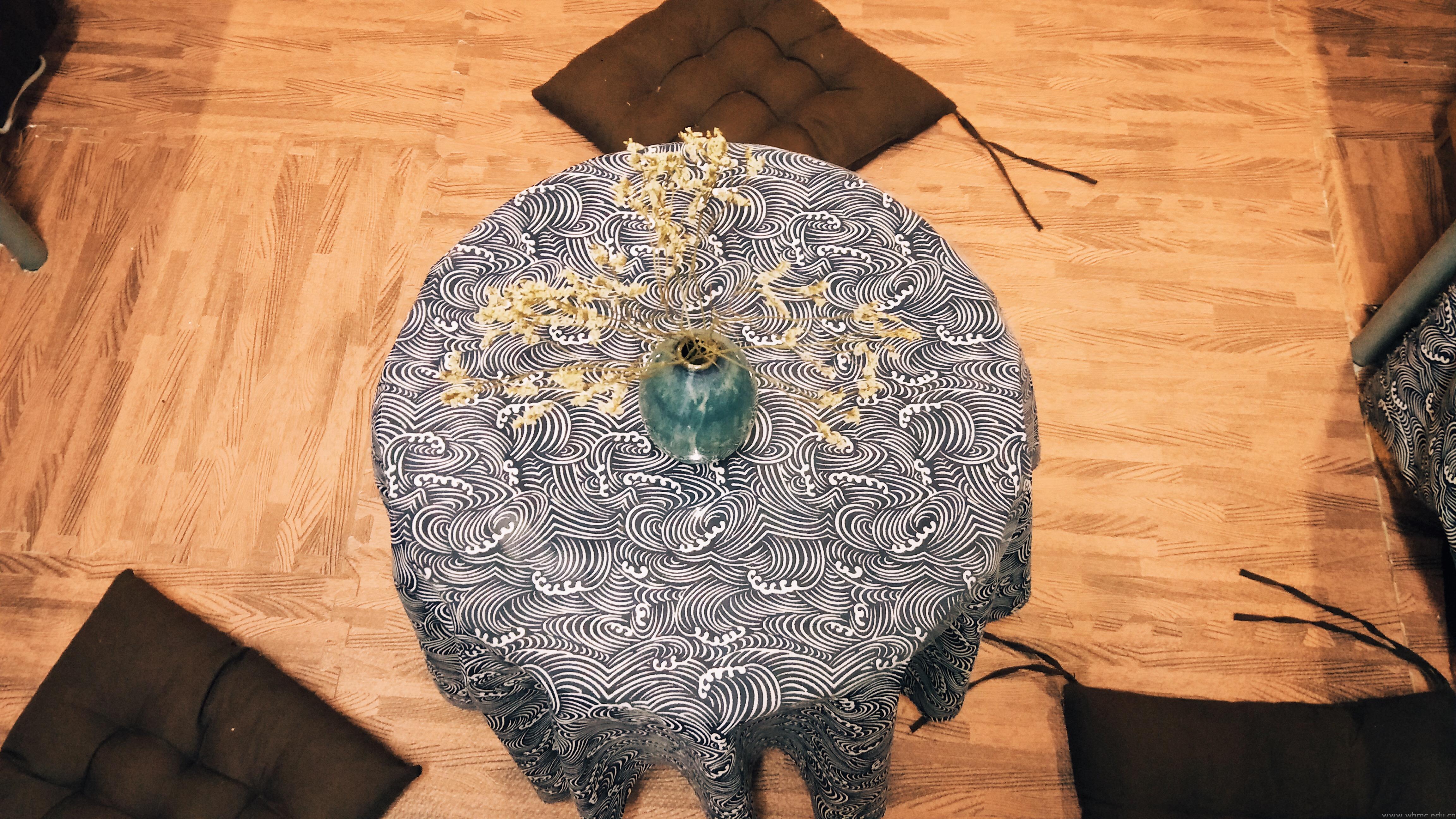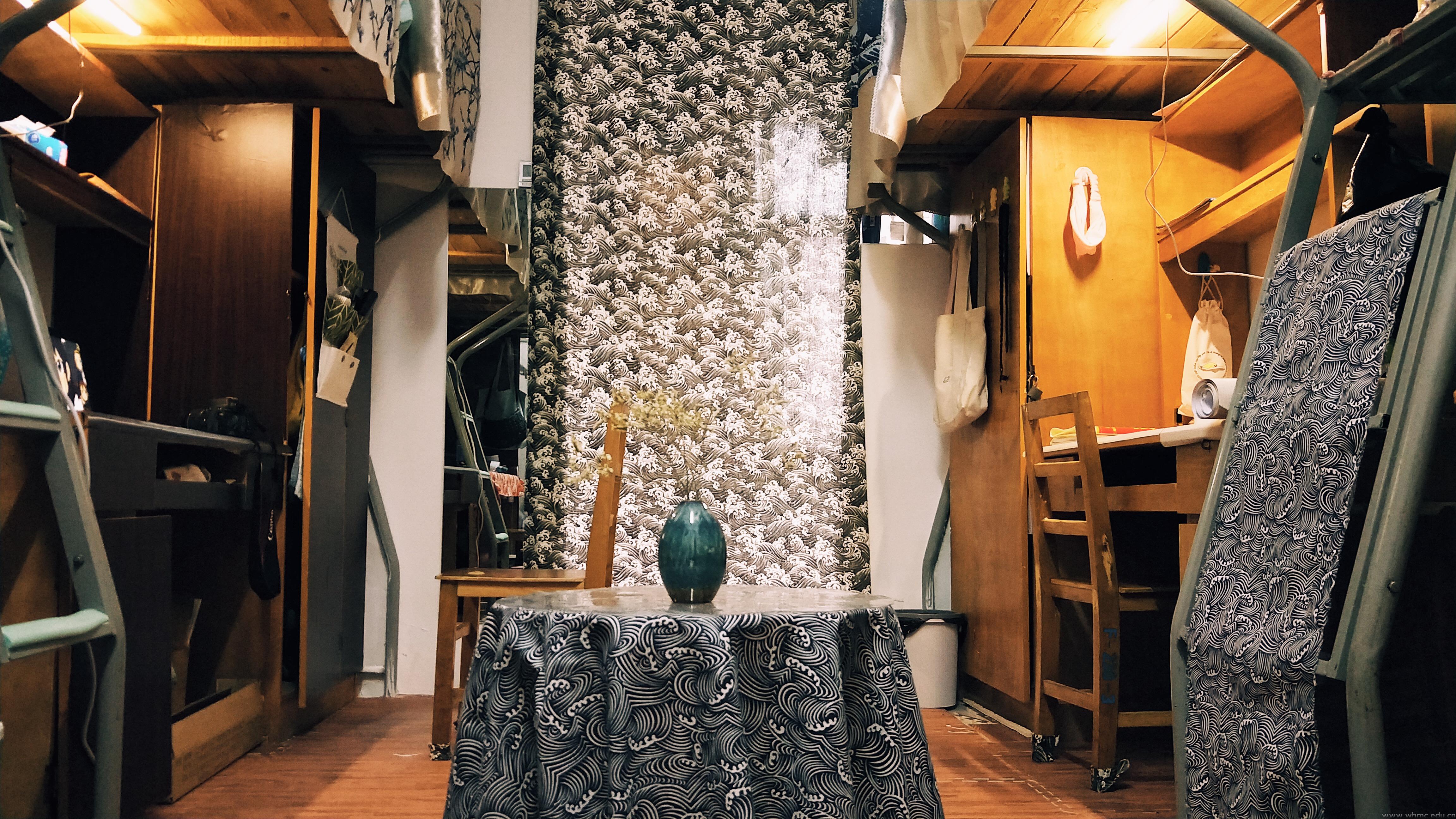 深蓝色海浪花纹的门帘、木头黄色的地垫、书桌上黑色仿木纹贴纸在灯光下很温暖。寝室中间放置的小圆桌上盖着和门帘一样花纹的桌布,与黄蓝相间的床帘相得益彰。寝室内和风气息浓厚,给人一种家的感觉。