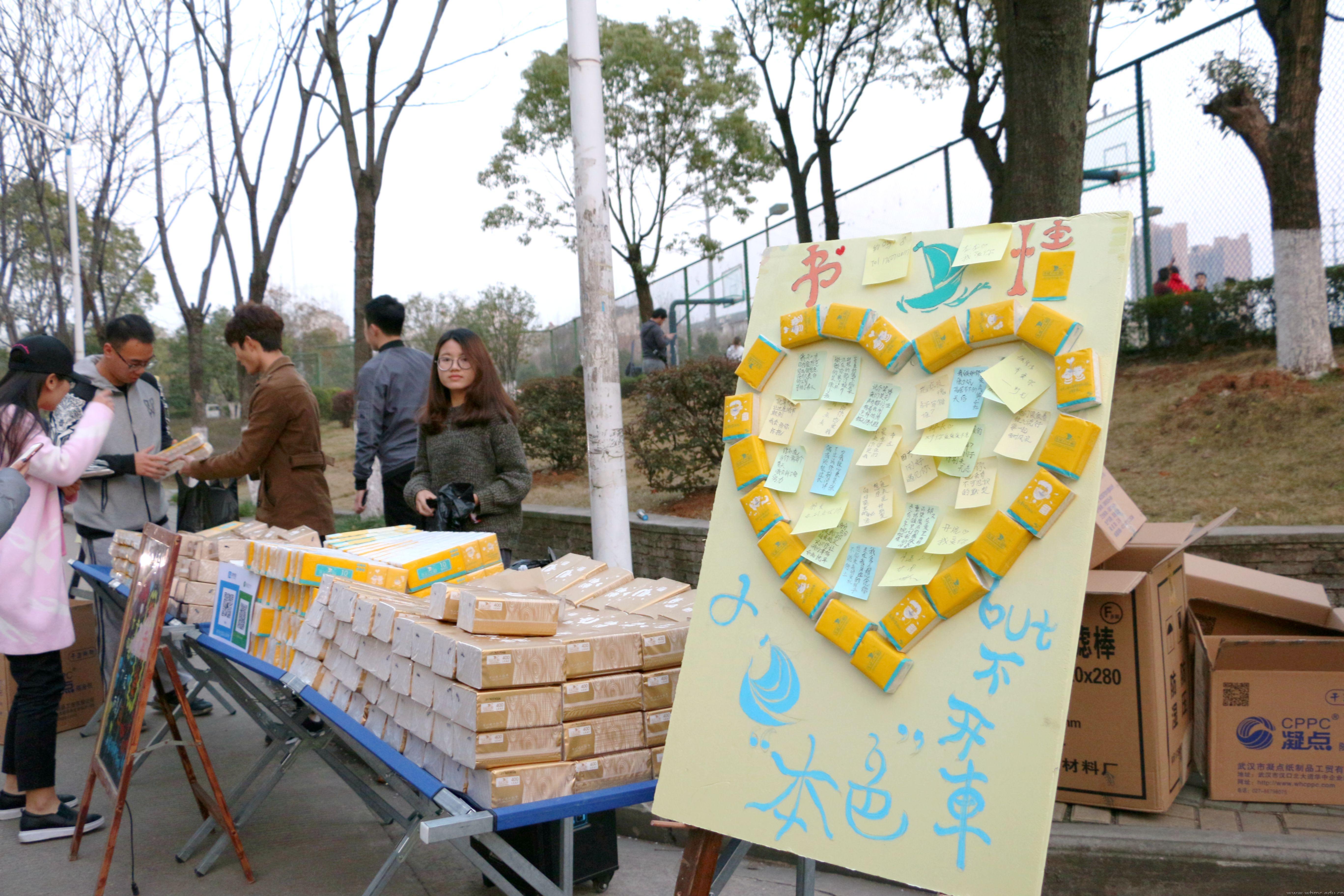 成箱的纸巾被有序地摆放在摊位上,有小包的抽纸包也有一条十包售卖的小包纸巾,两种包装,同一价位。售卖的纸巾的正面共有5种图案,分别是女生照镜子化妆的化妆型,爱心包围着情侣的恋爱型,2号球员炫耀肌肉的运动型,一手握着薯条蛋糕一边想着减肥的减肥型,以及绑着“奋斗”头巾的学霸型。纸巾的背面印着“友谊的小船”的标志。