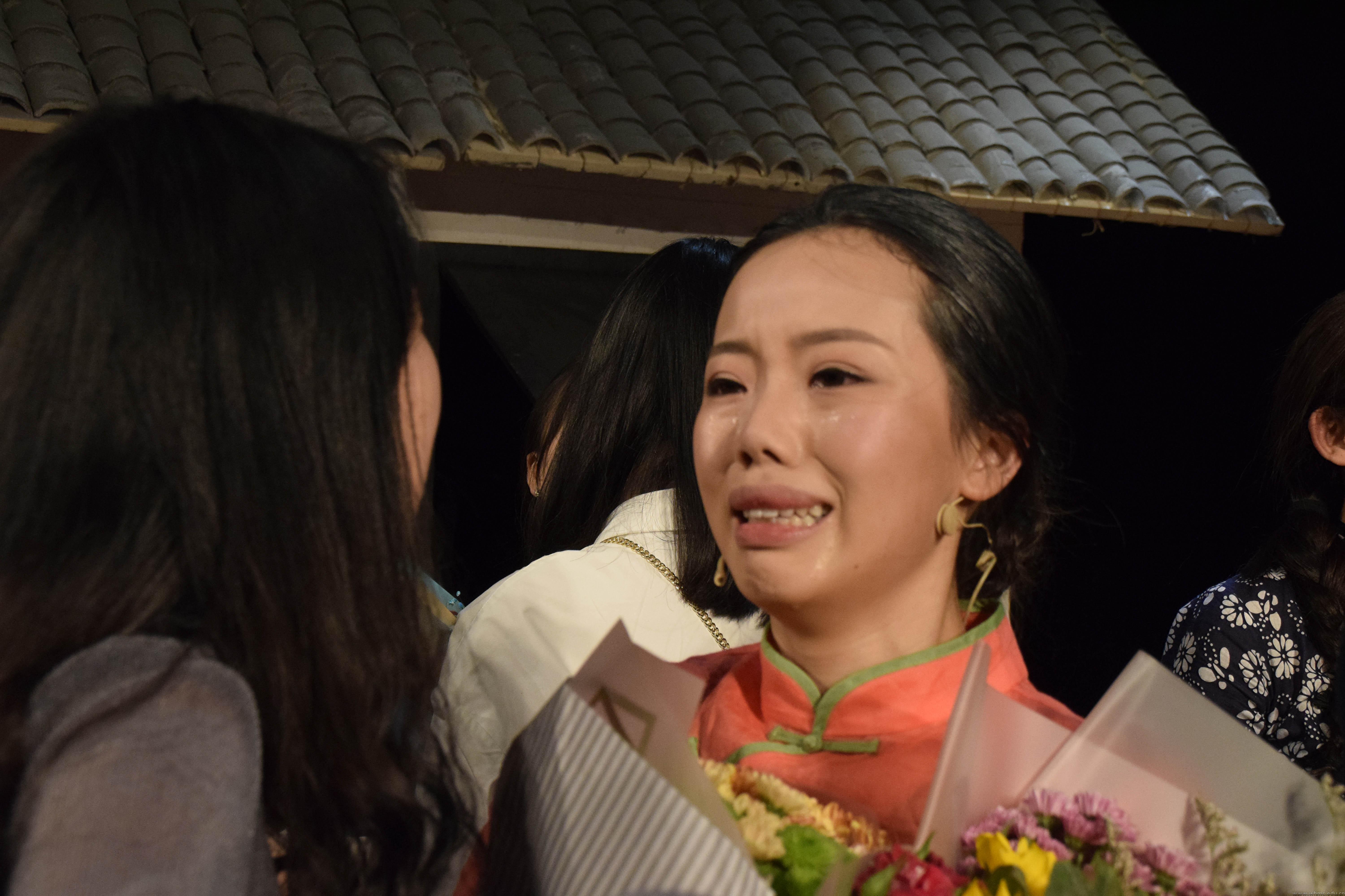 佘依洋在《南食店》中饰演王月英。从1947年到2007年,几十年的时间跨度,王月英从青年到老年,不同的时间段服装、道具,说话声音、方式都不一样。“演中年王月英的时候,我就在脑海里想我妈妈的样子,尽可能的去模仿她。”佘依洋说。没想到表演时候还在想的妈妈,谢幕时她就看见妈妈捧着从家乡长沙带过来的花束泣不成声。除了妈妈,佘依洋的爸爸和两位闺蜜也来到现场观看演出,因为担心到学校来不及买花,四人都从长沙抱着花一路带到武汉,给她一个惊喜。