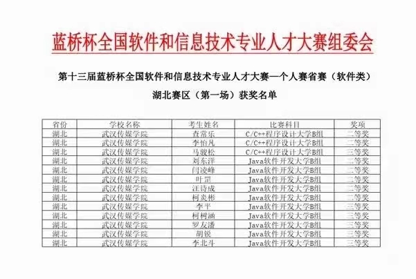 (武传新闻网讯 记者 骆博)近日,蓝桥杯大赛组委会公布“第十三届蓝桥杯全国软件和信息技术专业人才大赛省赛软件组”成绩,我校传媒技术学院共有13名学生获奖,其中二等奖7名,三等奖6名,实现了我校该项比赛获奖人数的新突破。