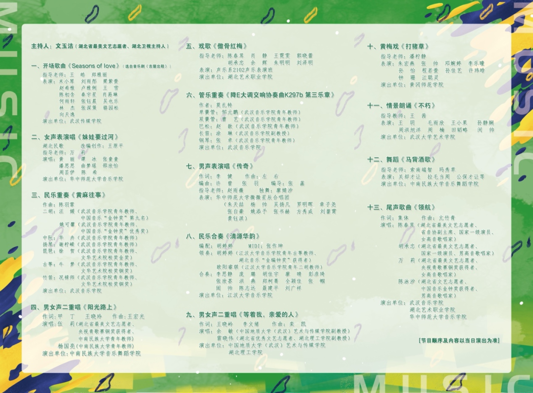 据悉,此次高校专场演出还邀请了我省主要音乐专业院校的师生参演,其中包括了武汉音乐学院、华中师范大学音乐学院、中南民族大学音乐舞蹈学院、武汉大学艺术学院、中国地质大学(武汉)艺术与传播学院、江汉大学音乐学院、湖北理工学院、黄冈师范学院、武汉艺术职业学院等。