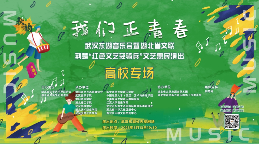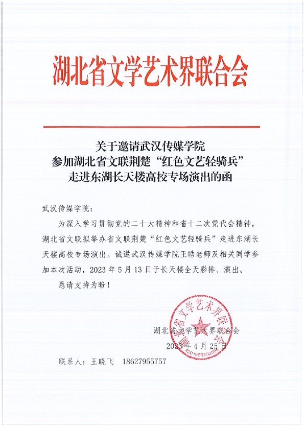 5月13日,我校音乐表演专业师生受湖北省文学艺术界联合会邀请,参加了此次荆楚“红色文艺轻骑兵”走进东湖长天楼【高校专场】演出,并同步于“荆楚网”在线直播。