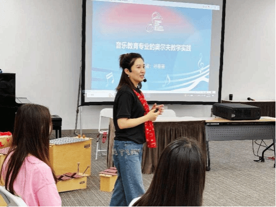 在分享会中,孙赛赛老师还进行了《音乐教育专业的奥尔夫教学实践》的主题汇报,将我校“学、用、展、评、转”——“五位一体”系统化的循环教学模式与实践基地幼儿园的奥尔夫教学进行融会贯通,以省级一流课程《基础音乐教育教学法》为依托,以“五位一体”的培养方式培养美育工作者为目标,并在实践基地幼儿园开展奥尔夫教学,最终以中国传统文化的奥尔夫音乐课例创编与演示结束,将“五位一体”真正做到的系统化循环教学的落地,受到广泛好评。