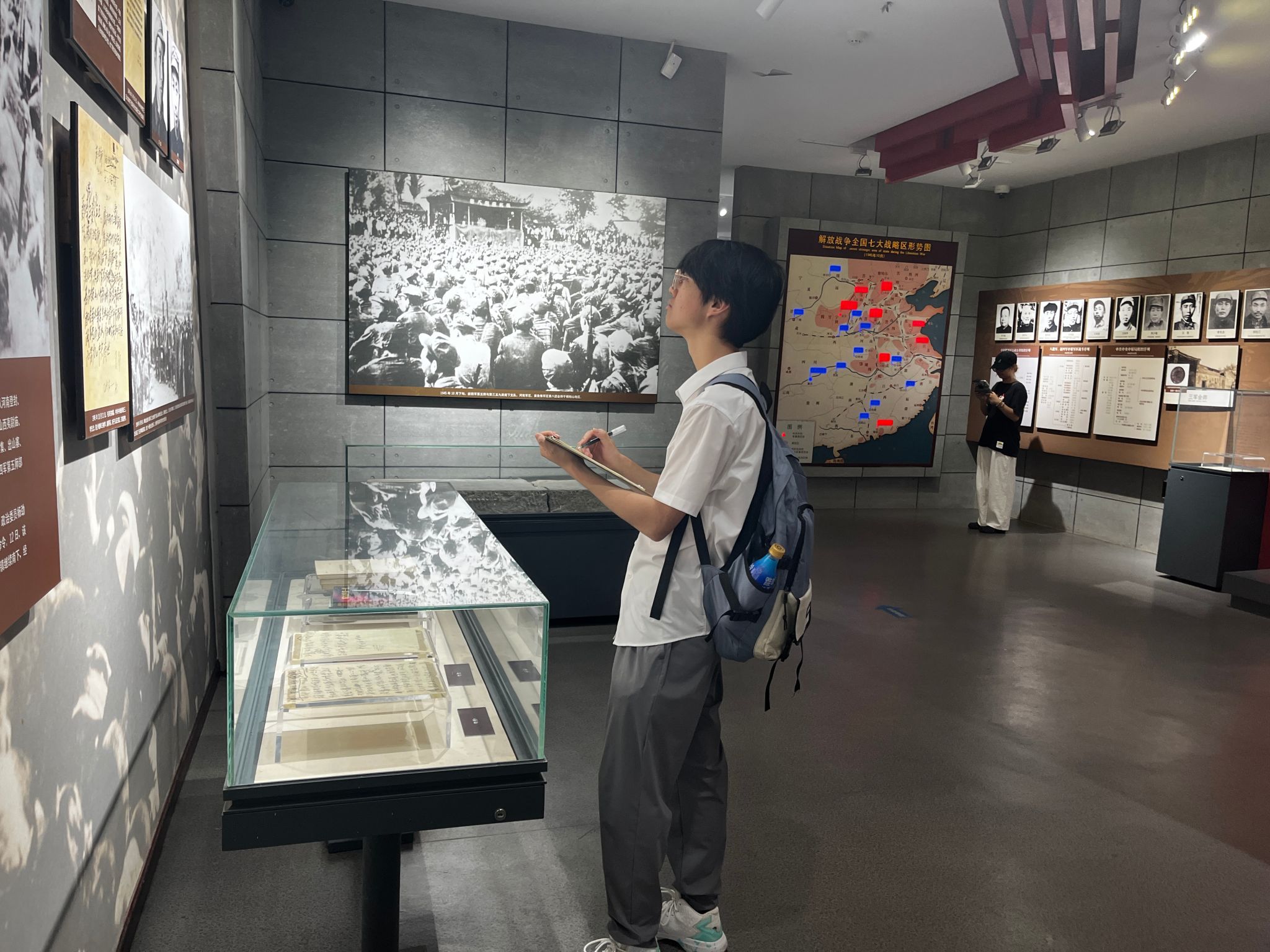7月,实践团队师生从武汉市区出发抵达孝感,辗转两个多小时,抵达纪念馆。在带队教师王雪的指导下,团队成员观摩学习纪念馆内的每一件文物、每一张照片,在行走中触摸历史脉动。“这可比坐在教室里生动、有趣得多,我们如果能用数字手段再现这一切,就能让更多同学在线上沉浸式体验这段历史,太棒了!”队员王若汐与同行的同学们分享着激动之情。在听完讲解后,同学们用随身携带的纸笔和单反相机对整个馆区作了初步的素材采集。