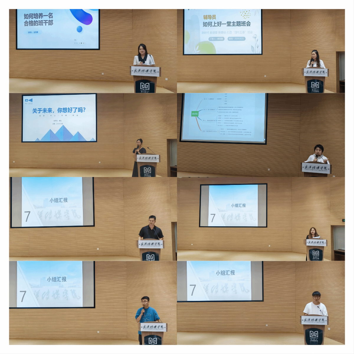 8月23日上午,各个学院的辅导员从班情分析、带班理念、服务学生举措、班团建设成效以及班级存在的问题等方面进行了说带班展示,新闻传播学院王万茹老师带来《如何培养一名合格的班干部》分享。下午播音主持艺术学院李思思老师带来《如何上好一堂主题班会》分享,电影与电视学院龚航老师和设计学院钱怡老师分别就主题班会和晚点名进行了展示,各小组代表就研讨内容进行了汇报。