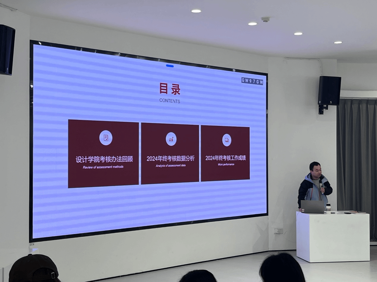 党总支副书记王龙对设计学院过去一年的工作进行了全面的总结,他从学院考核办法回顾、2024年终考核数据分析,2024年终考核工作成绩三个部分展开总结,并分析了这些方面在实际工作中的执行情况和效果,指出了存在的问题和不足,并提出了改进措施。