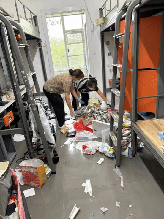 宿管科作为保障主力,提前两周开展宿舍设施 “体检”,宿管员逐一对毕业生房间进行排查,累计上报门窗、灯具、水电等设施问题 300 余处。退宿手续办理当天,全体宿管员开启 “全天候” 服务模式。20 余名宿管员化身 “清洁卫士”,仔细清扫每一间毕业生离开后的宿舍。一位连续工作 18 小时的宿管阿姨表示:“再累也要让新同学住进干净的房间。”