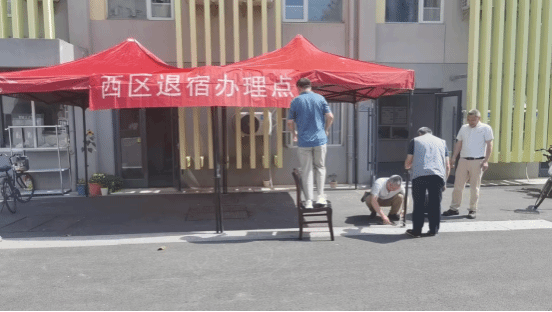 后勤处蔡能处长全程驻守宿舍区,实时关注各点位情况。“东区需增派 2 名托运人员!”“西 4 栋楼下垃圾加急清运!” 发现人员拥堵或物资短缺,他立即协调跨科室支援。看到女生独自搬运重物,他主动上前帮忙;发现退宿队伍过长,当即增开临时窗口。