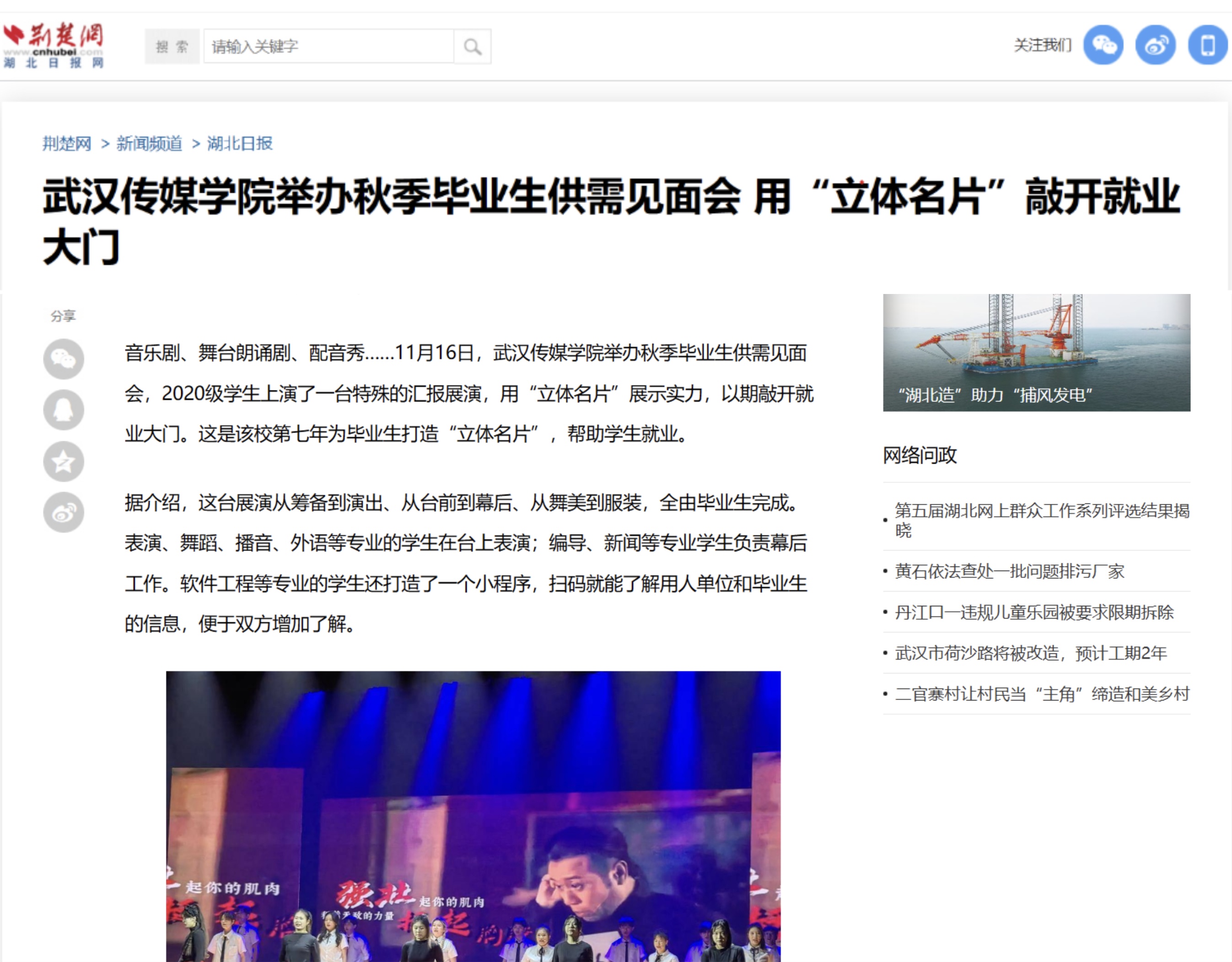 音乐剧、舞台朗诵剧、配音秀……11月16日,米兰体育网页版登录举办秋季毕业生供需见面会,2020级学生上演了一台特殊的汇报展演,用“立体名片”展示实力,以期敲开就业大门。这是该校第七年为毕业生打造“立体名片”,帮助学生就业。